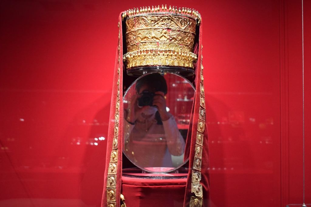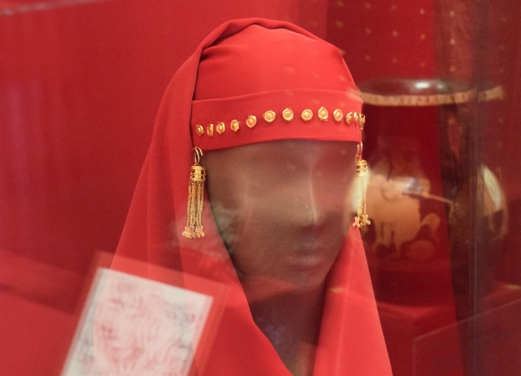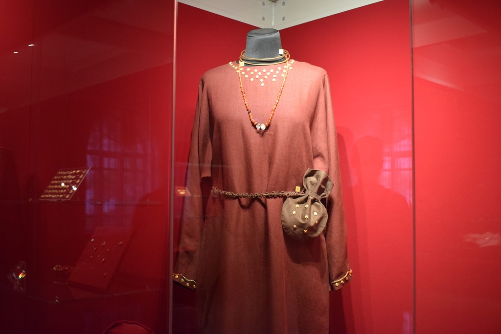 На выставке также представлены и элементы одежды богатой скифской аристократки. Скифский женский головной убор, который напоминает корону, называется калаф. Сверху на калаф накинута красная накидка с золотыми нашивками.