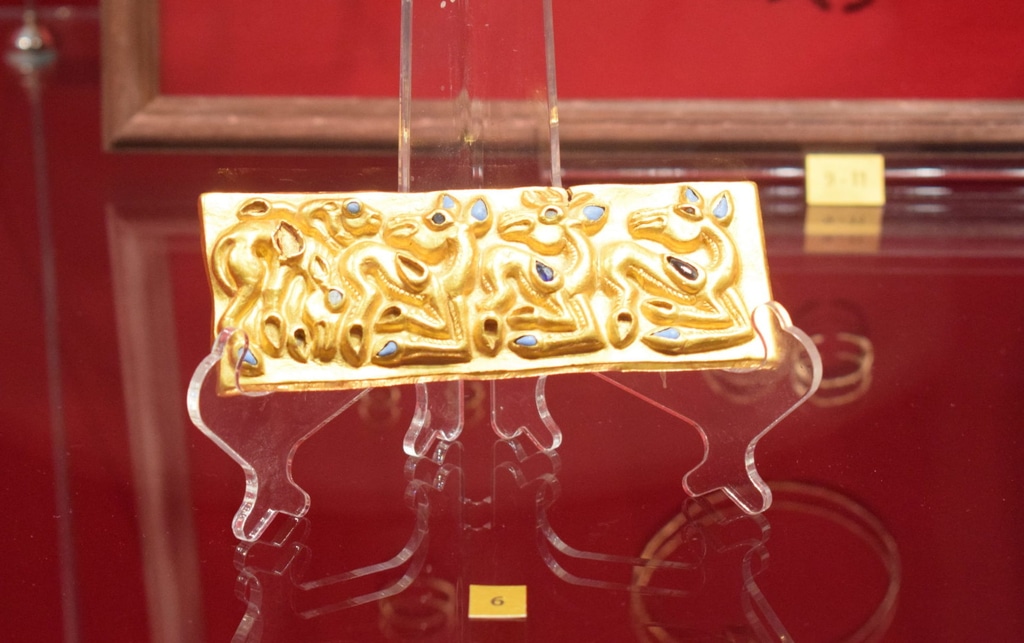 Следующее украшение для одежды — золотая поясная пластина с изображением охоты на оленей.