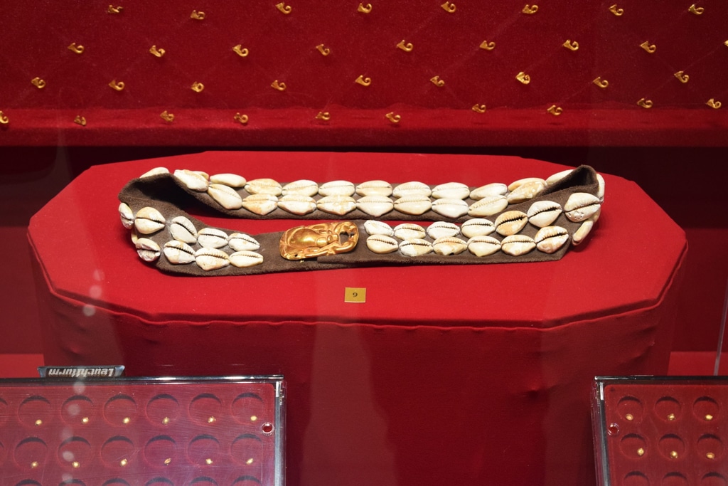 Пояса украшались не только золотом, но и ракушками. На поясе с ракушками изящная застежка в виде золотого жука.