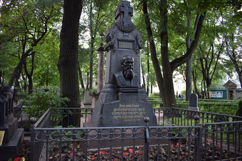 За Надвратной церковью по обе стороны дороги раскинулись Тихвинское и Лазаревское кладбища. Лазаревское кладбище возникло еще в начале 18 века и предназначалось для захоронений привилегированных слоев общества. К 19 века оно было заполнено и решено было организовать новое кладбище — Тихвинское. Именно на Тихвинском кладбище и похоронен Достоевский, а также его жена и внук.