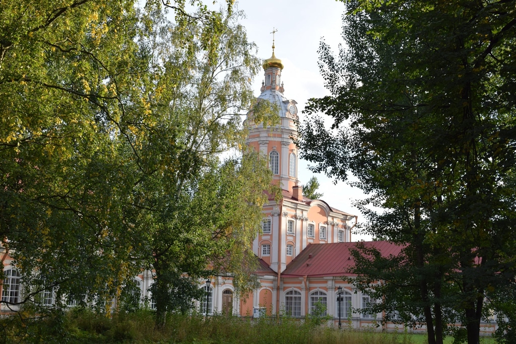 Далее по мосту через речку Монастырку мы зашли уже на территорию самого монастыря. У самого входа нас встречает Благовещенская церковь — самый старый храм обители. Его построили в начале 18 века как усыпальницу для членов царской семьи. В ней в 1800 году был похоронен известный полководец Суворов.