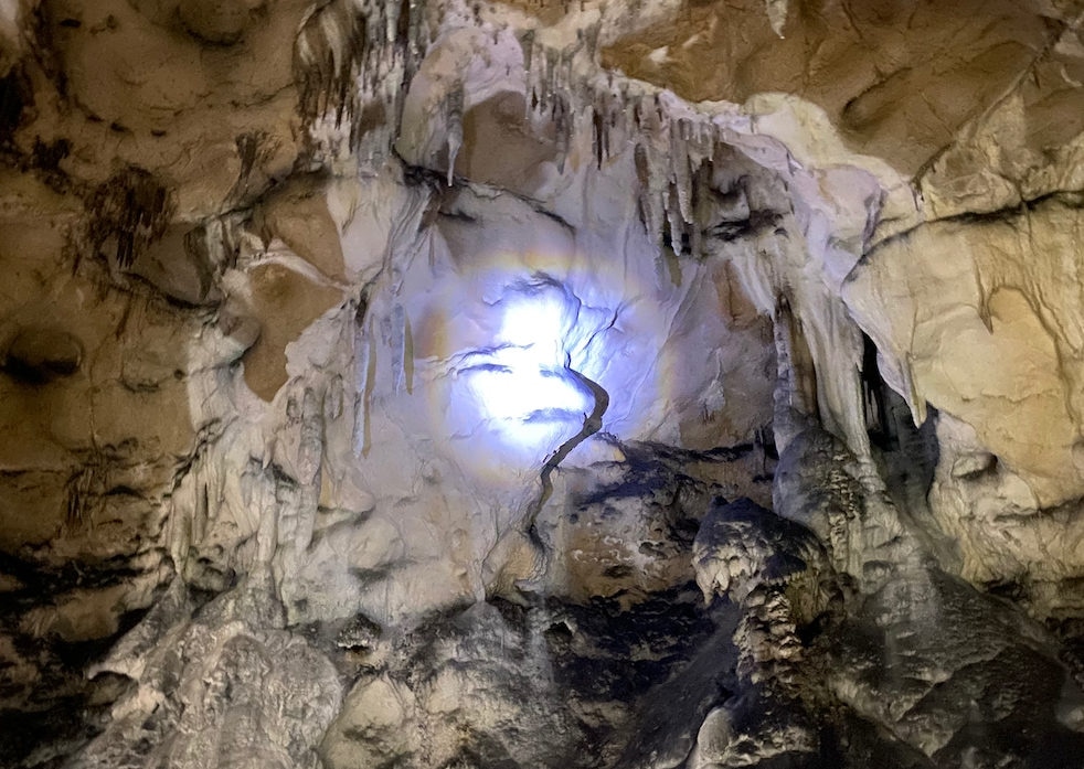 На стенах пещеры при внимательном рассмотрении можно увидеть причудливые силуэты людей и животных. Одно из таких природных творений — человеческое лицо. Оно специально подсвечено неярким голубоватым светом.