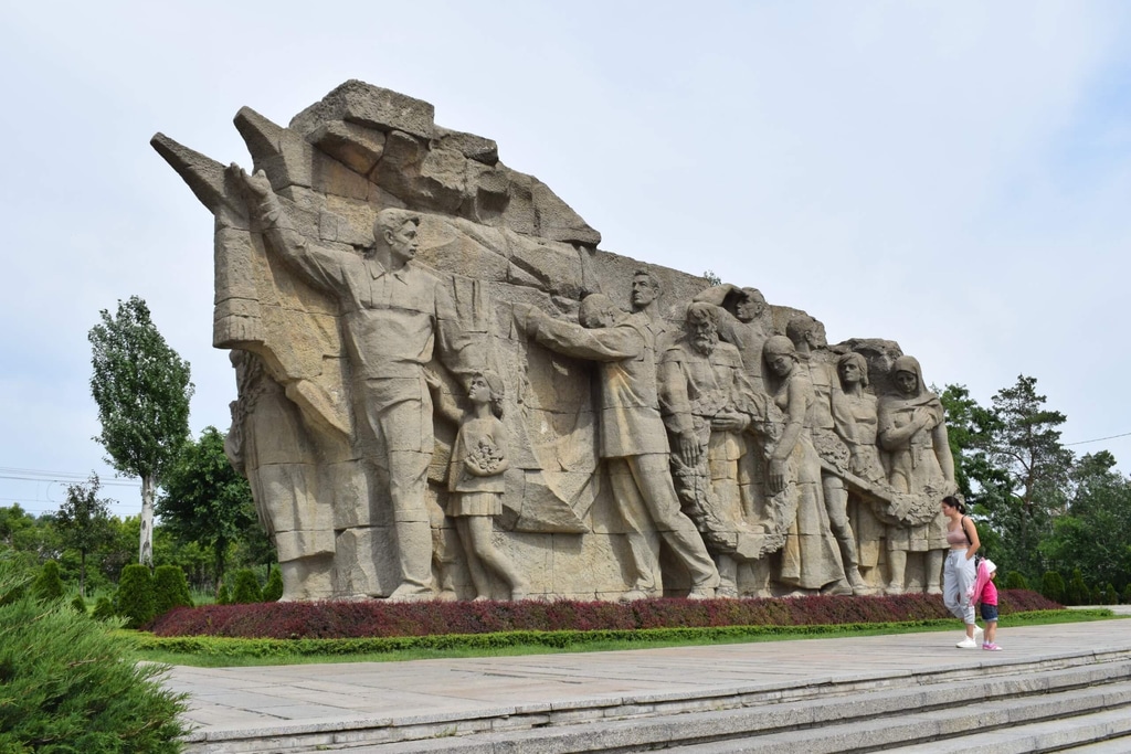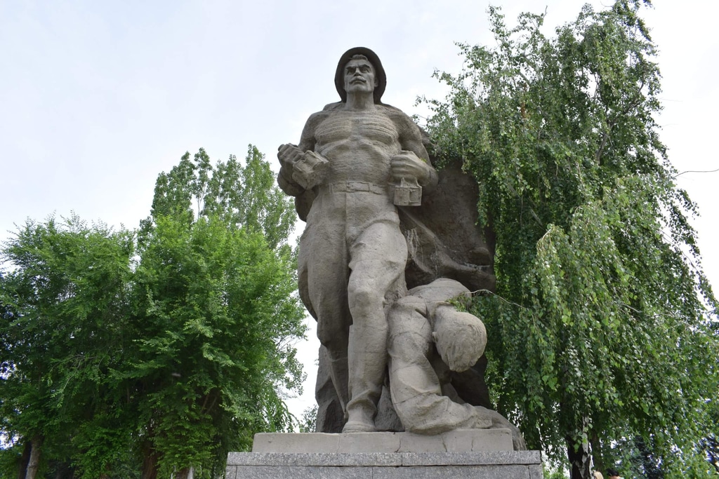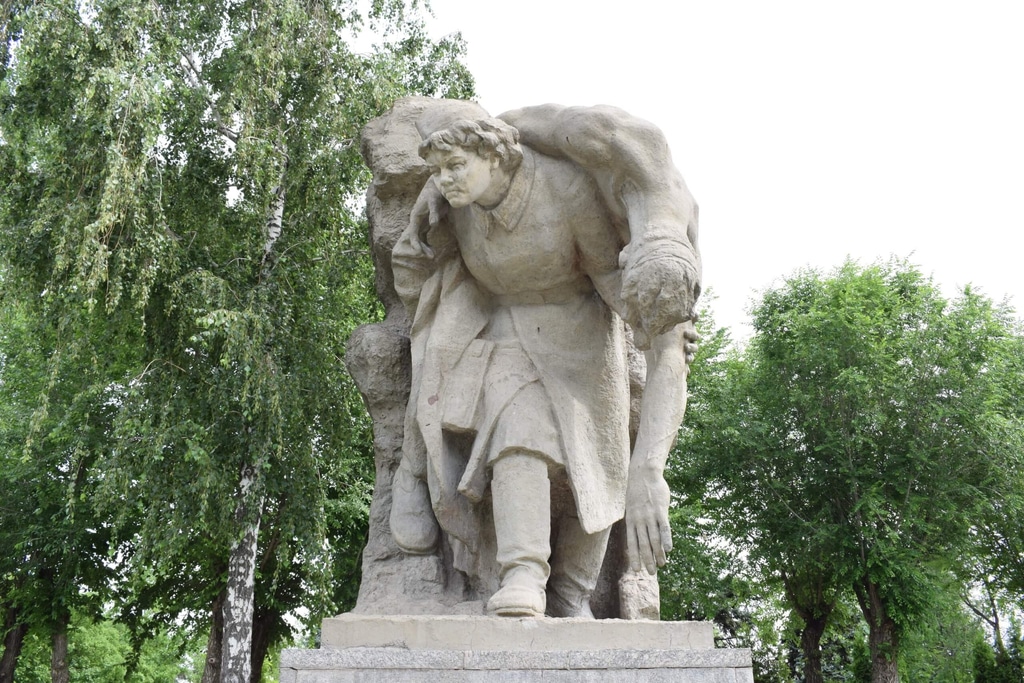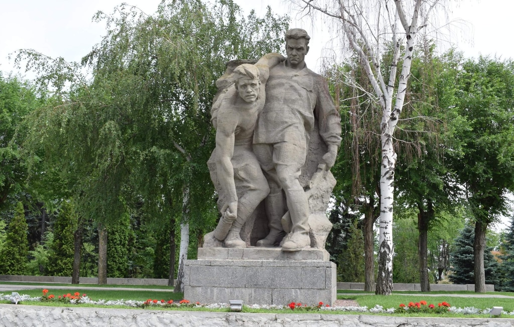 Здесь же на Площади героев установлены сюжетные солдатские скульптуры. В каждой из них запечатлен конкретный эпизод боя. Например, вот боец помогает раненому однополчанину.