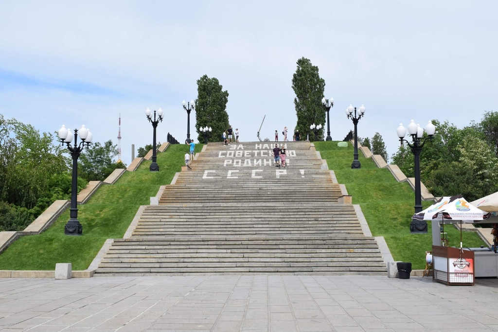 От горельефа на Мамаев курган ведет лестница с выразительной надписью на ступенях: «За нашу Советскую Родину — СССР!» Это слова с воинской медали «За оборону Сталинграда».