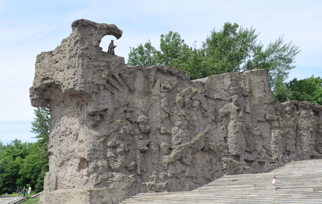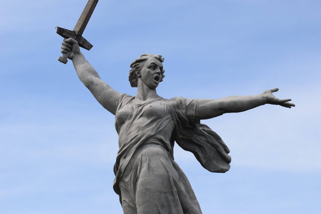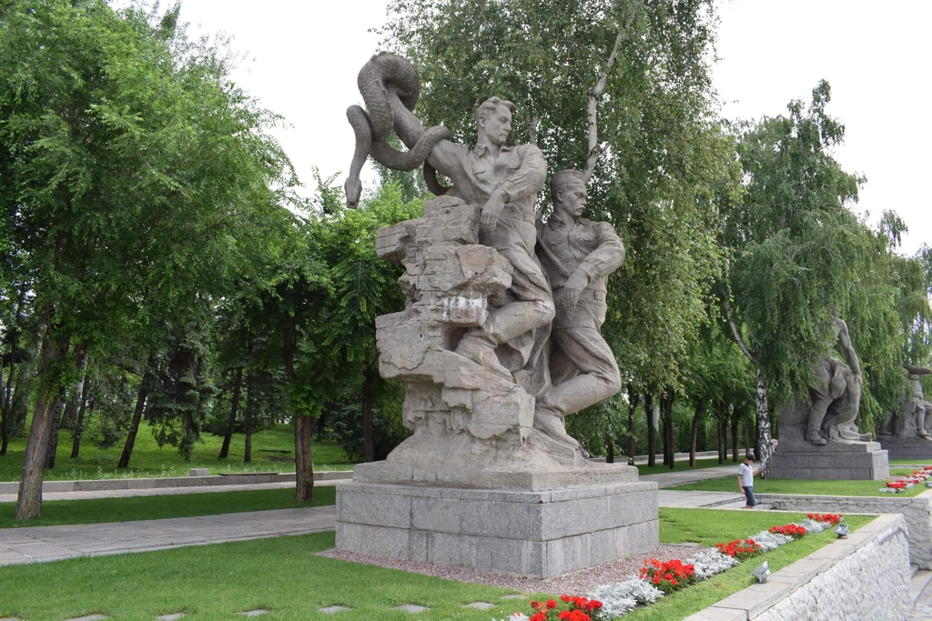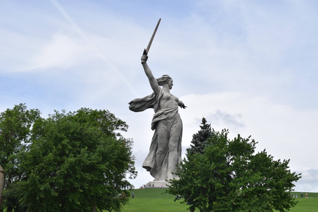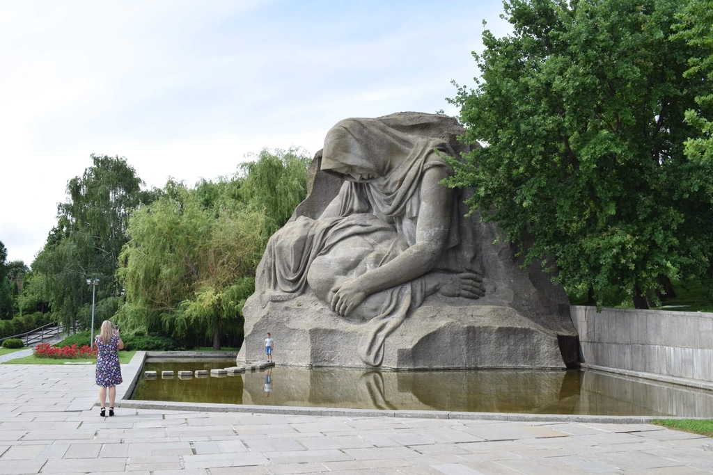 И наконец, главный монумент мемориала — «Родина-мать зовет!» Скульптура представляет собой образ женщины в героическом порыве с мечом в руке. Она зовет своих сыновей на борьбу с врагом.