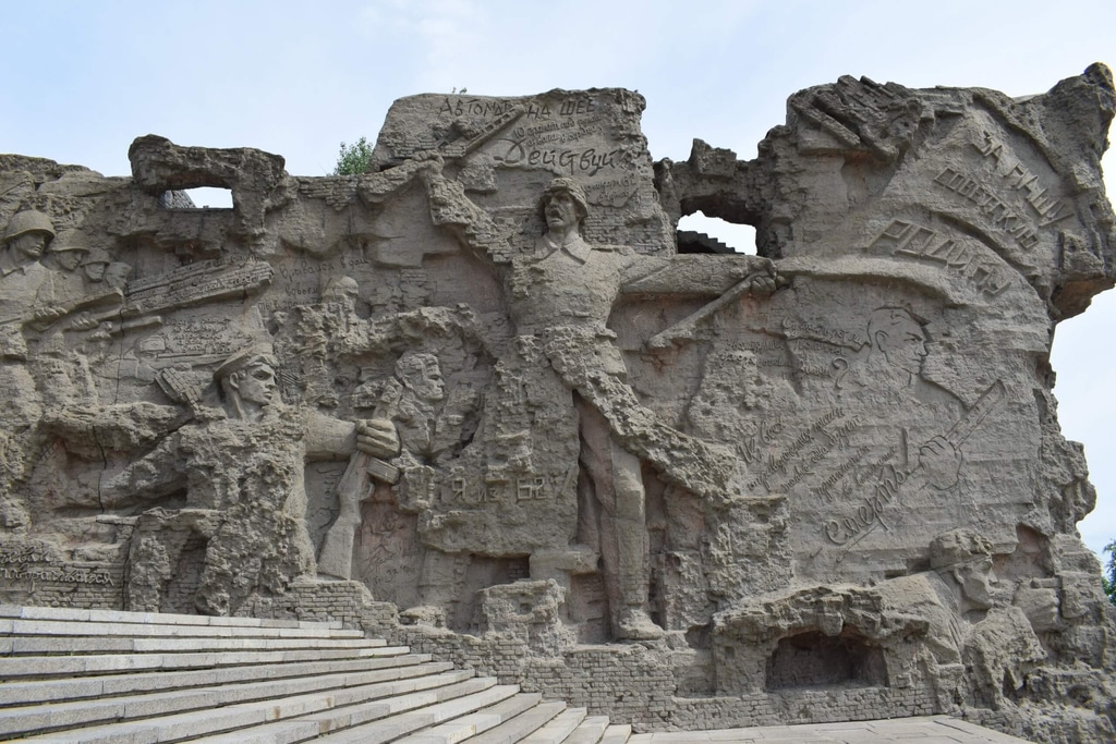 От площади «Стоять насмерть!» по 40-метровой лестнице наш путь лежит к Площади героев. По обе стороны лестницы возвышаются Стены — руины со сценами уличных боев. Сражения во время Сталинградской битвы шли за каждую улицу, каждый дом, каждый этаж. Бои были такими ожесточенными, что после битвы Сталинград буквально весь лежал в руинах.