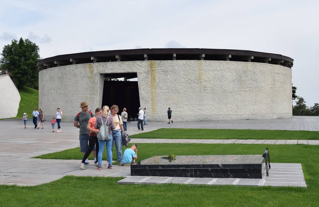 Дальше от Площади героев мы идем к Площади скорби и строгому цилиндрическому зданию Зала Воинской Славы.