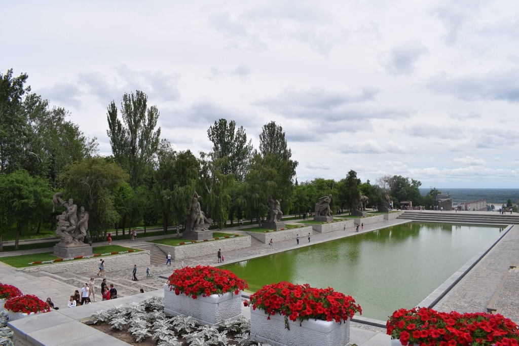 Поднявшись по лестнице вдоль Стен — руин, мы выходим на самую большую площадь — Площадь героев. Центральную часть площади занимает большой прямоугольный бассейн. Он символизирует Волгу, на берегу которой собственно и проходила Сталинградская битва.