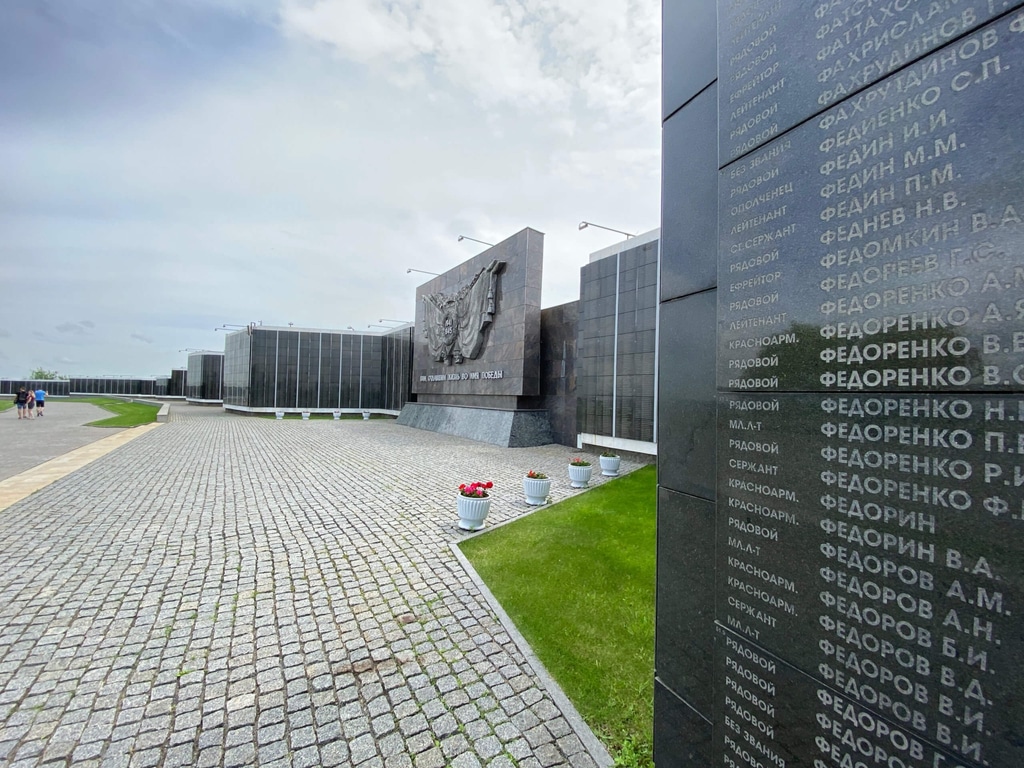 С одной стороны мемориальное кладбище ограничивает мраморная стена с фамилиями солдат, погибших на кургане.