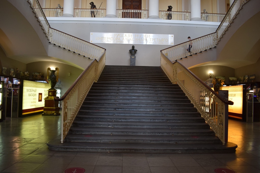 Ниже располагаются несколько фотографий Парадной лестницы и залов Русского музея. Надо сказать, сами интерьеры музея не блещут особой роскошью и совсем не напоминают дом монарха. За редким исключением залы, в основном, — обычные помещения со стенами неброских цветов. Пожалуй, те залы, фотографии которых размещены в статье, — самые красивые во дворце.