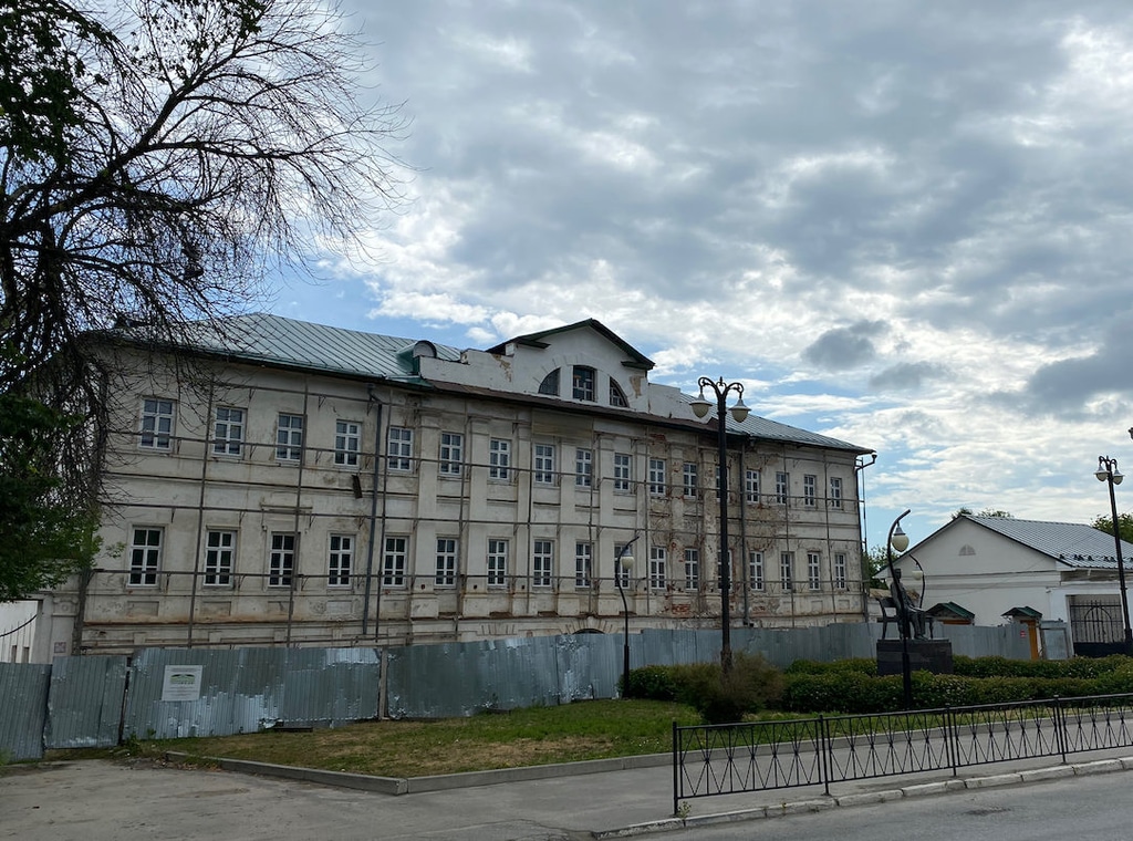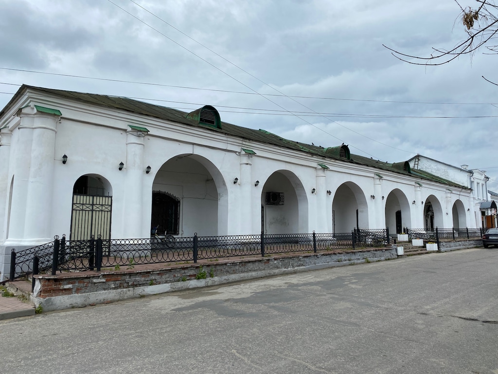 Справа от здания администрации тянутся старинные торговые ряды. Чуть дальше на улице Первомайской находятся еще две достопримечательности: дом купца Зворыкина и здание городской управы.