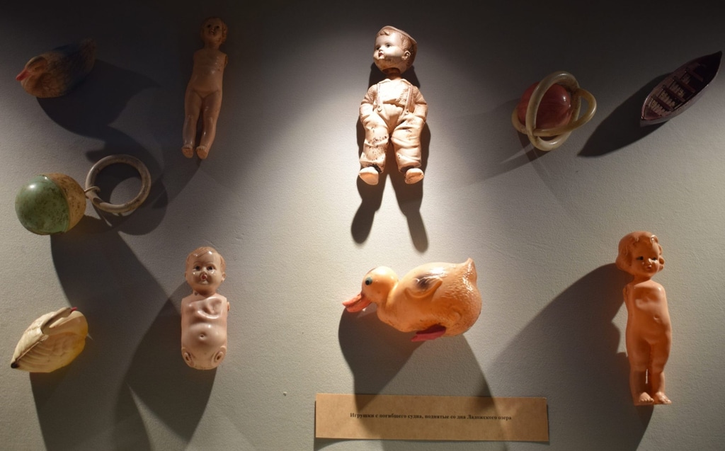 В период блокады детей и больных власти пытались эвакуировать из блокадного Ленинграда. Их везли на машинах по льду Онежского озера. В результате частых бомбежек многие из эвакуированных погибли. Эти детские игрушки в послевоенное время выловили из озера. Без слез просто невозможно на них смотреть.