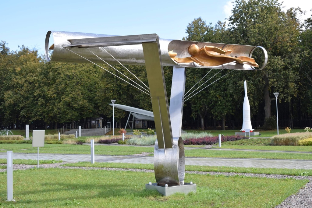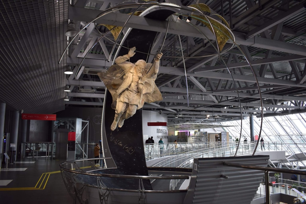 Музей истории космонавтики носит имя Константина Циолковского. Летящая фигура ученого попалась нам на глаза в самом начале экспозиции.