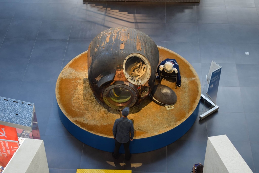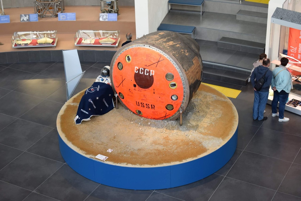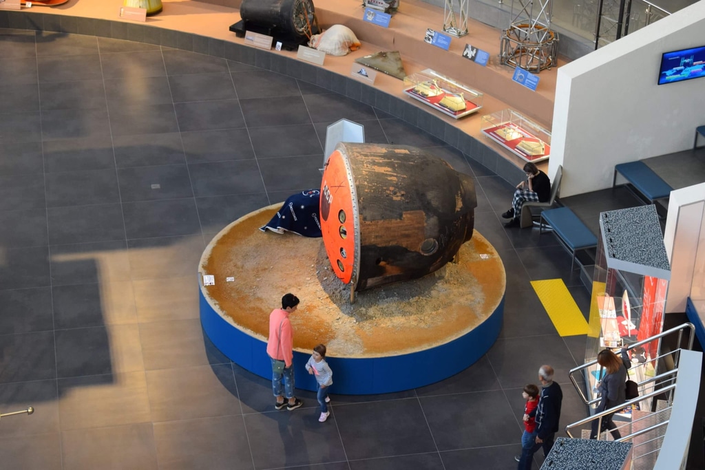 Спускаемся на первый этаж и перед нами — спускаемый аппарат космического корабля «Союз-34». Хорошо видно, как аппарат обгорел, пока спускался на Землю и преодолевал космическое пространство.