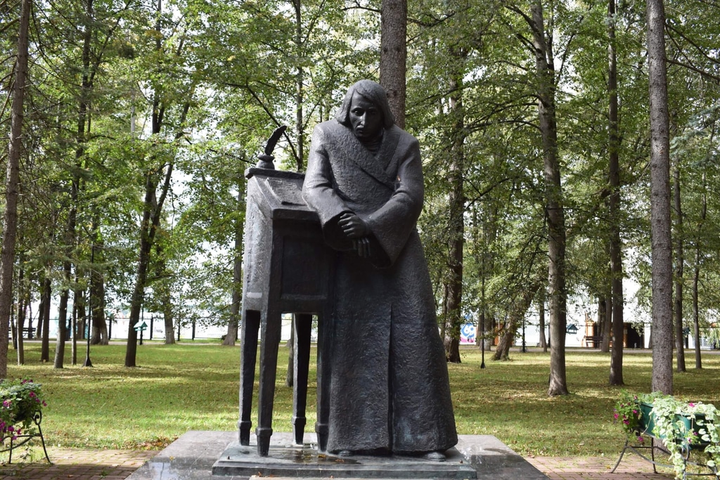 Парк хранит память не только о знаменитом ученом, но и об известном писателе Гоголе. В 19 веке в глубине сада стоял скромный домик. В нем какое-то время и жил Николай Гоголь. Домик, к сожалению, не сохранился. О его существовании напоминает только памятник писателю. Стоит писатель, облокотившись на конторку, и думу думает. Судя по всему, тяжелая эта дума, ой, тяжелая…