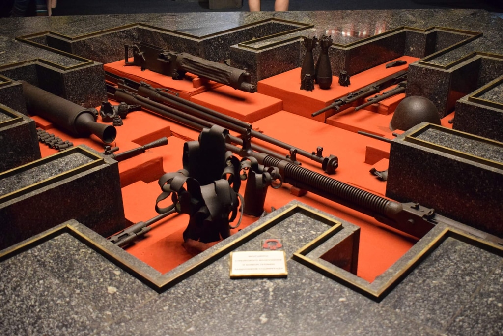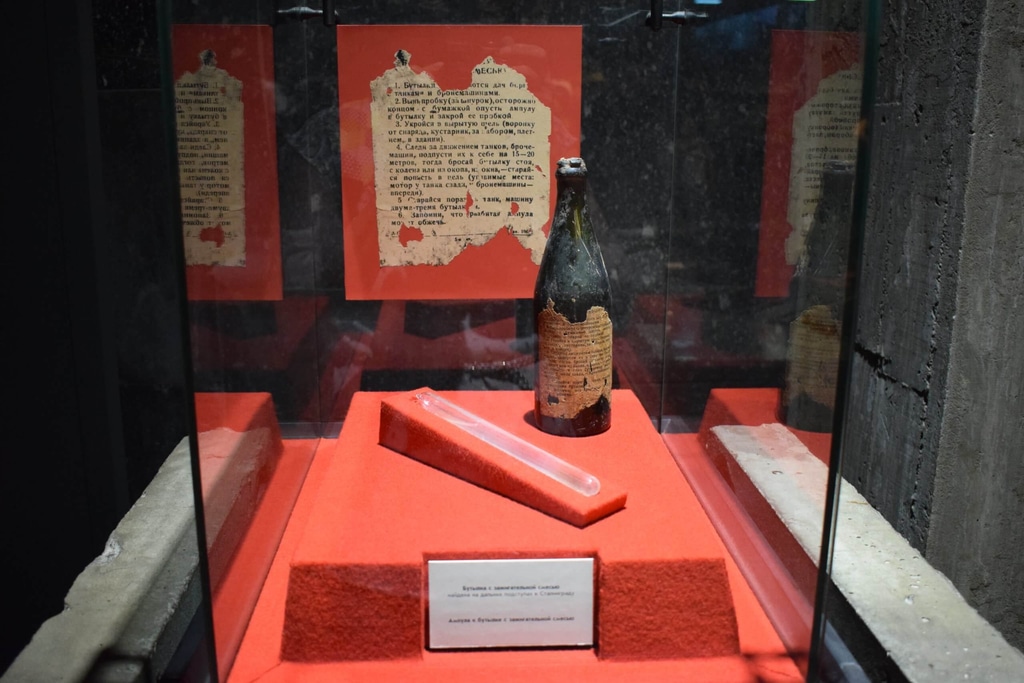 В одной из витрин можно увидеть бутылку с зажигательной смесью для подрыва танка. За ней висит инструкция с правилами использования. Как написано на табличке, экспонат нашли в окрестностях Сталинграда. Судя по всему, произошла какая-то ошибка и бутылка осталась целой.