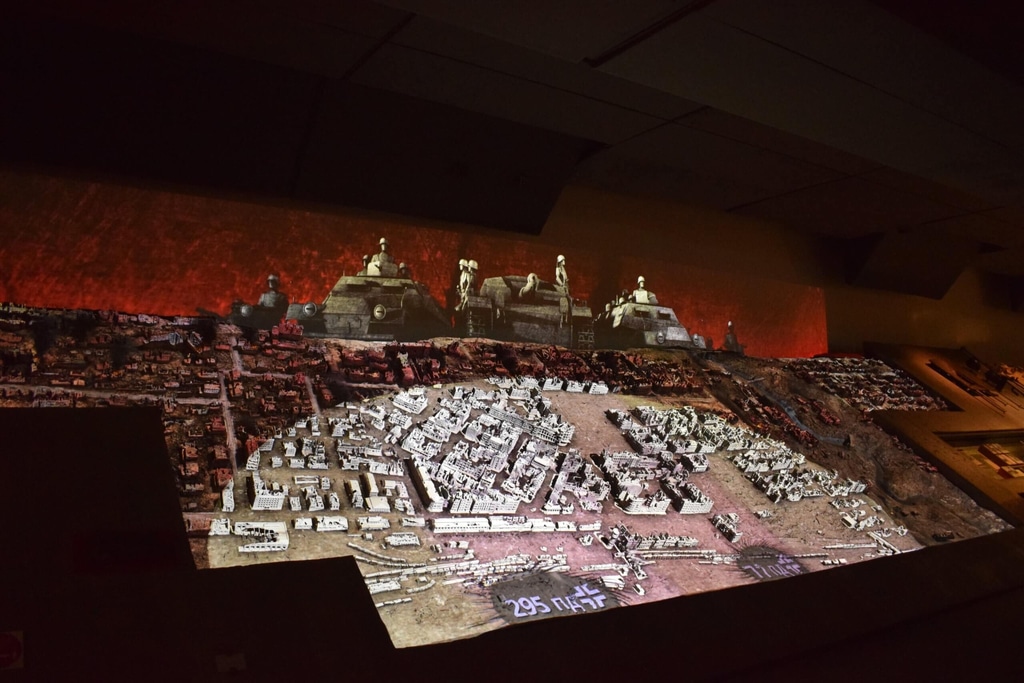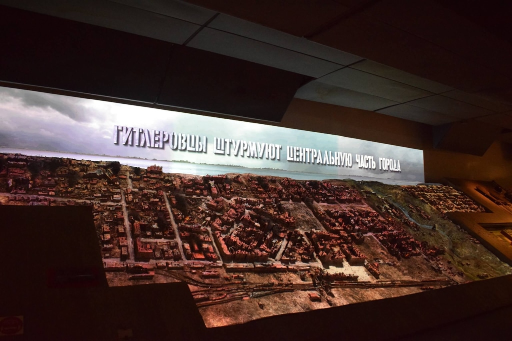Одним из главных экспонатов музея является интерактивный макет с демонстрацией обороны Сталинграда. В течении 10 минут на нем наглядно демонстрируется, как менялся город во время боев. Сначала перед нами мирный довоенный Сталинград. Затем бомбардировки, уличные бои и некогда красивый город превращается в серые безжизненные руины.