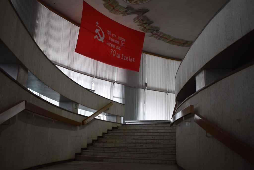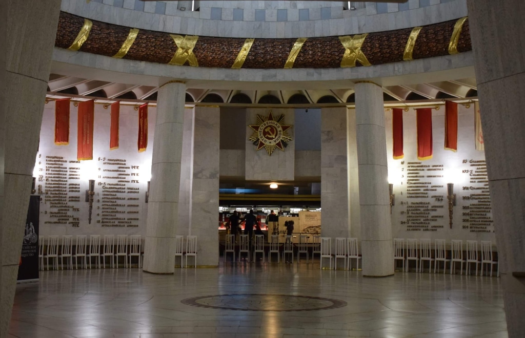 Залы первого уровня идут по кругу вокруг большого парадного зала со списками и флагами подразделений советской армии, которые участвовали в Сталинградском сражении.