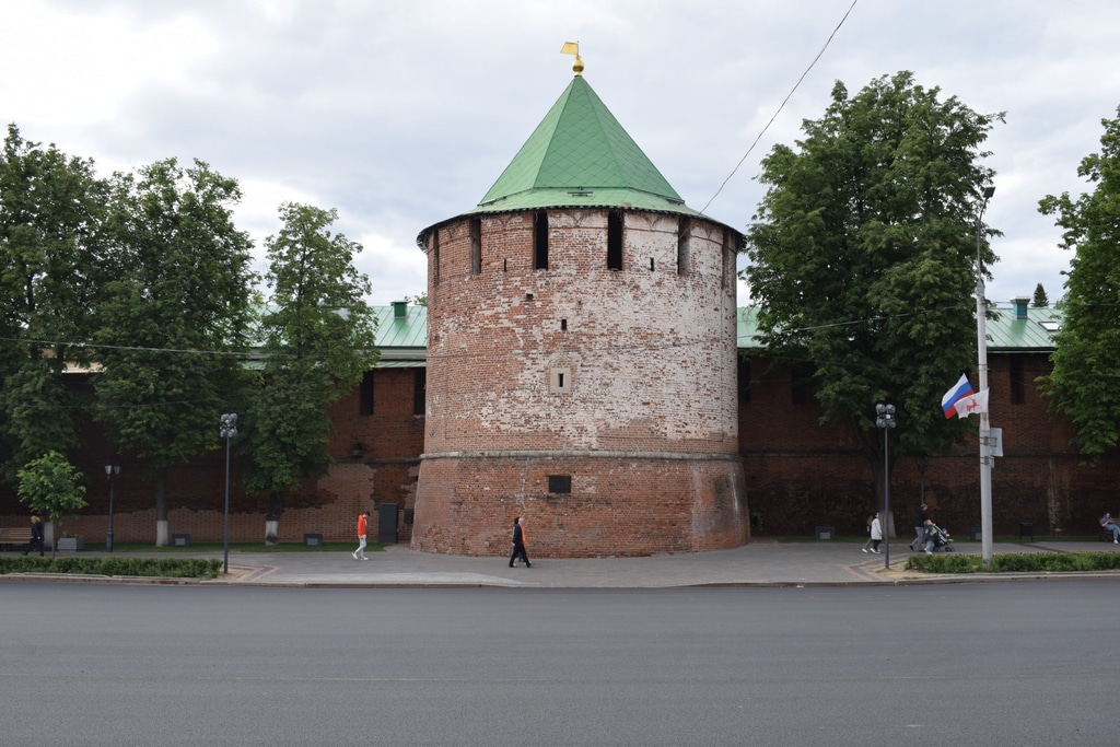 Начнем с Дмитровской башни — главной проездной башни Нижегородского кремля. Она выходит на центральную площадь Минина и Пожарского. По одной из версий считается, что башня названа в честь нижегородского князя Дмитрия.