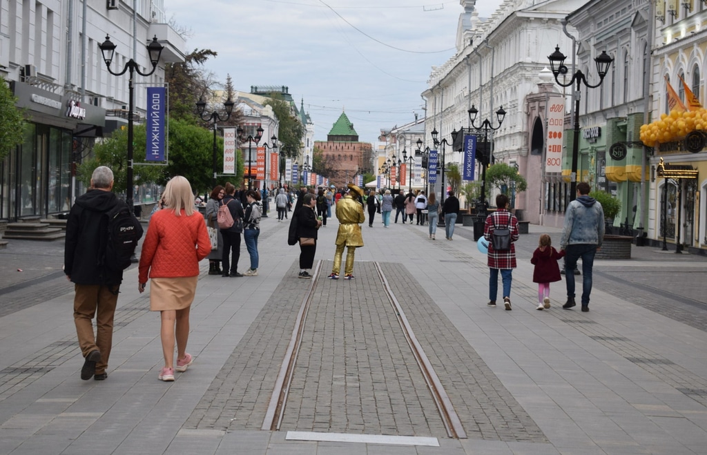 Главной улицей Нижнего Новгорода является Большая Покровская улица. Она берет свое начало от площади Минина и Пожарского и тянется к станции метро Горьковская и метромосту. Так эта улица выглядит сегодня. Вдали виднеется Дмитровская башня Кремля, а на земле под ногами небольшой кусочек старых трамвайных путей. Надо сказать, первые трамваи появились в Нижнем Новгороде еще до революции в 1896 году. Один из них ходил по Большой Покровской улице. Сегодня никакого транспорта здесь нет, только пешеходы.