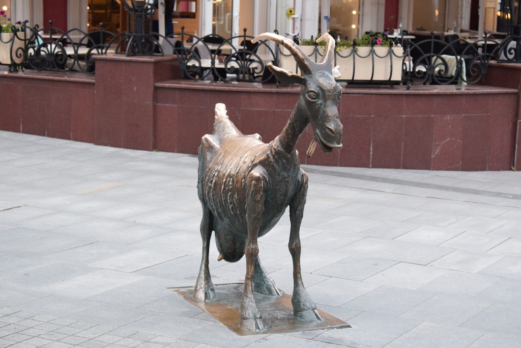 Здесь же недалеко от театра установлена и другая любопытная скульптура Веселая коза. Она появилась здесь в 2005 году в честь театральных капустников, регулярно проводимых в Нижнем Новгороде.