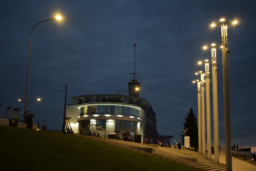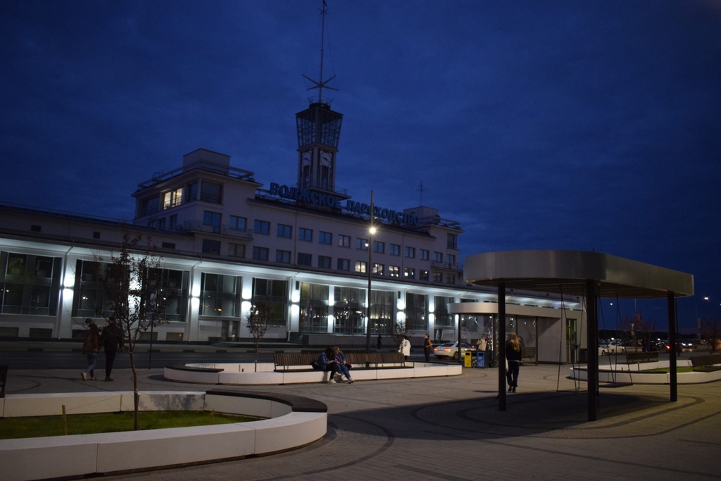 Так получилось, что на набережной мы оказались уже ближе к вечеру. Здесь повсюду горят разноцветные огни. Все это очень красиво смотрится. Также волшебно выглядит и речной вокзал Нижнего Новгорода. Он построен в 1964 году и по форме напоминает речное судно.