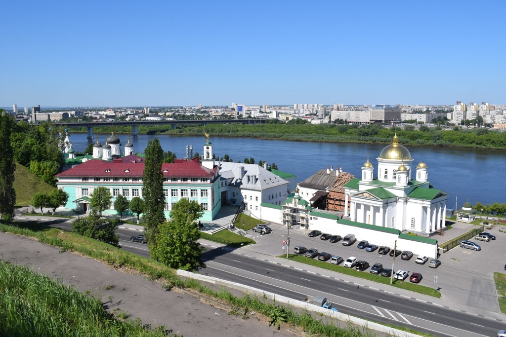 С горы Гремячей хорошо просматривается и другая достопримечательность Нижнего Новгорода Благовещенский монастырь. Он как раз находится у подножия горы.