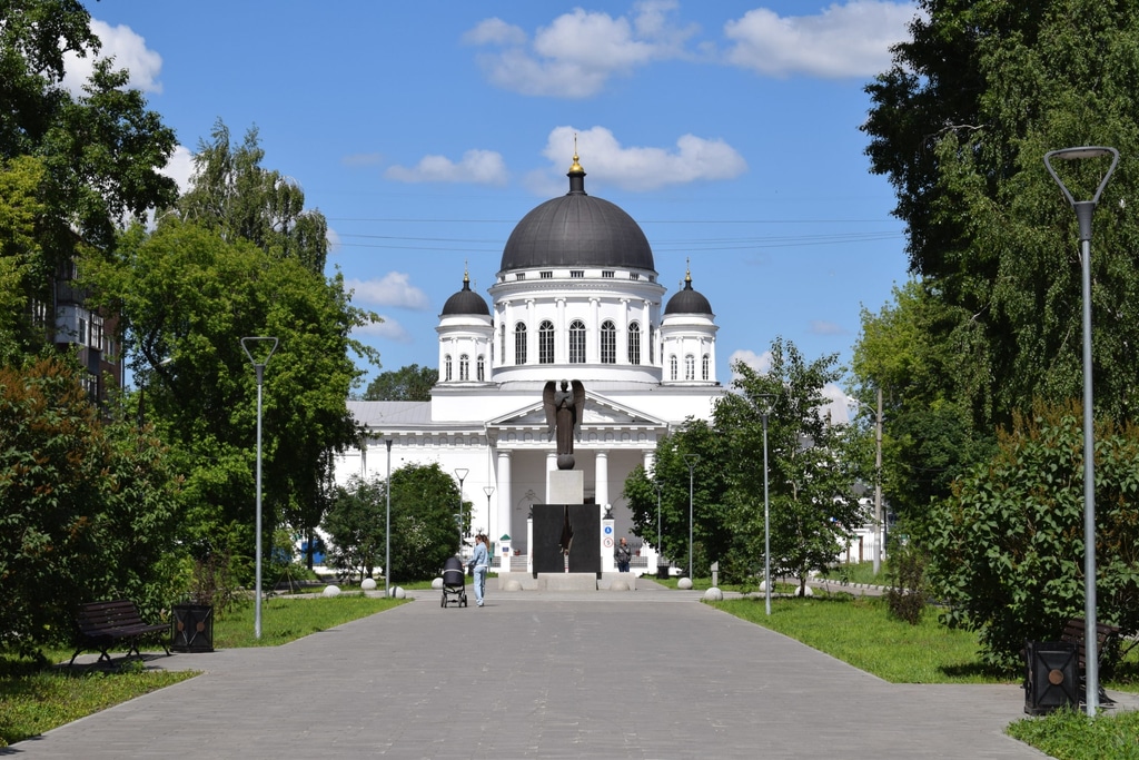 Спасский Староярмарочный собор старше своего собрата собора Александра Невского. Он построен в 1822 году. Храм соединяется с Главным ярмарочным домом зеленой аллеей. На аллее перед собором возвышается очень красивый памятник в виде ангела. Он открылся в начале 2000-х годов в честь подвига ликвидаторов Чернобыльской аварии.