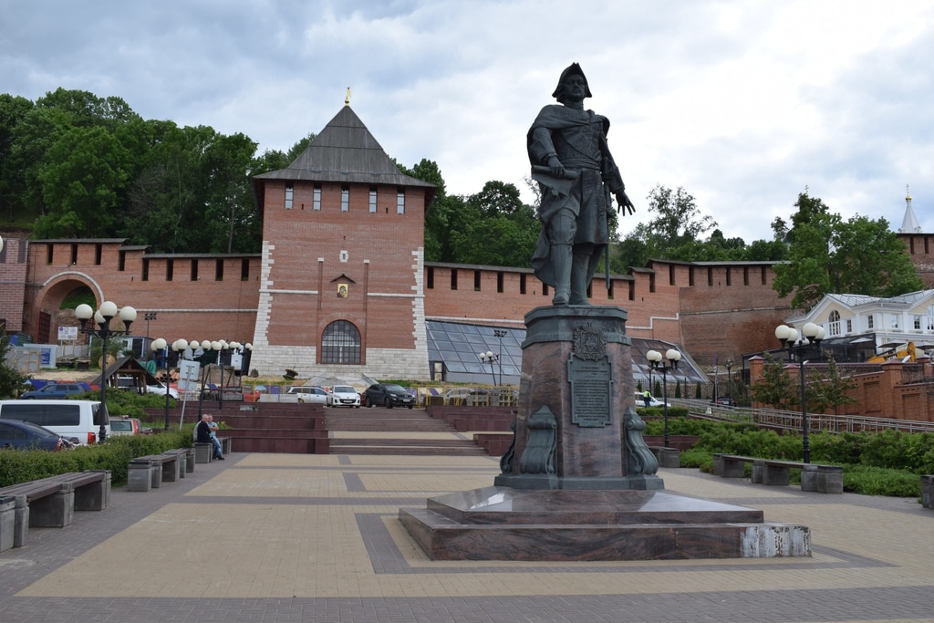 Прямо напротив Зачатьевской башни в скверике возвышается памятник Петру Великому. Он появился тоже недавно в 2014 году в честь важного для города события: образования в 1714 году Нижегородской губернии. Видимо, как раз об этом гласит указ, который держит в правой руке Петр Великий.