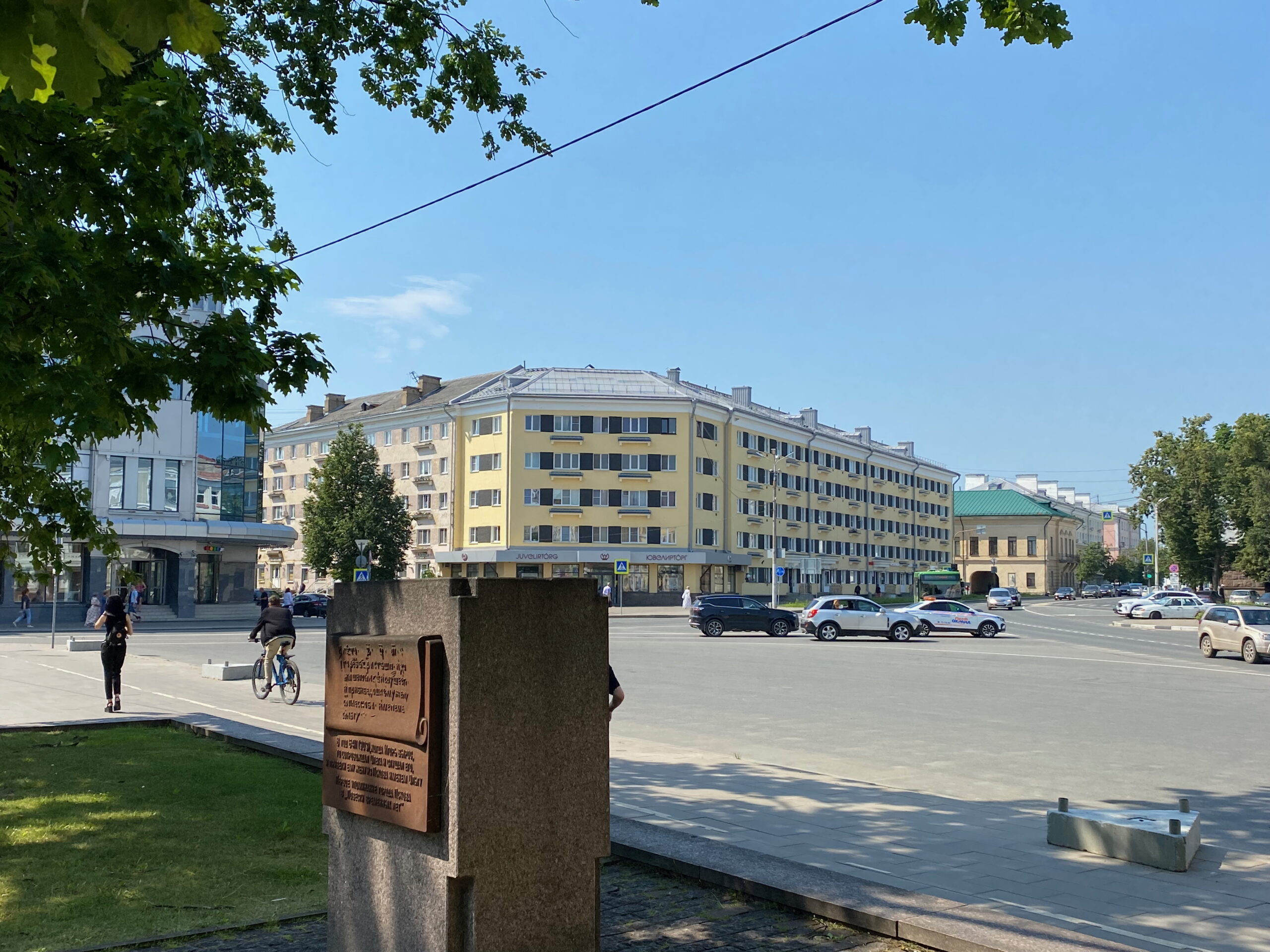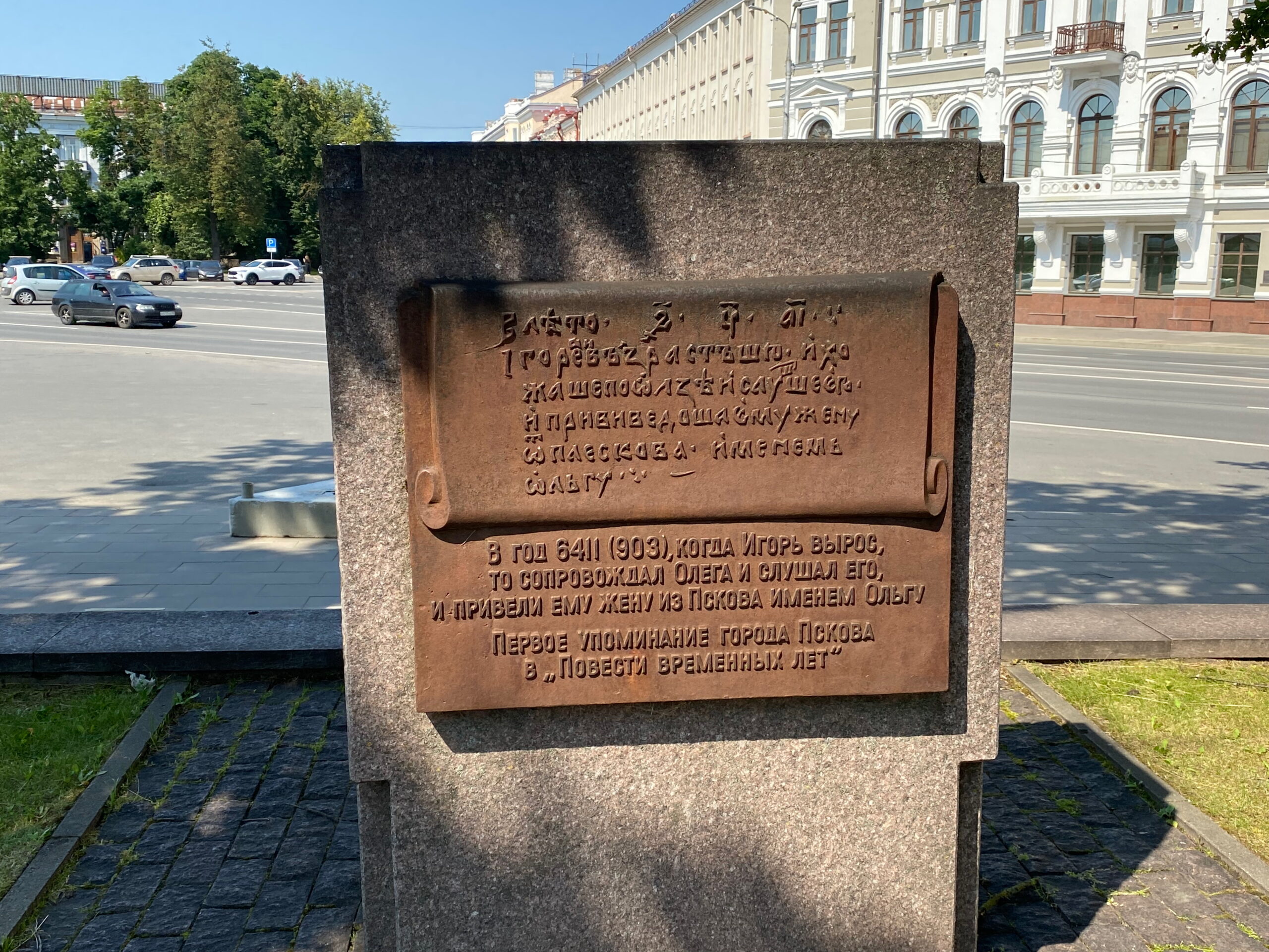 В 2003 году на краю Октябрьской площади установили памятный знак к 1100-летию Пскова. Город-то очень древний. В летописях упоминается аж под 903 годом, когда сын Рюрика князь Игорь взял себе в жены местную жительницу Ольгу.
