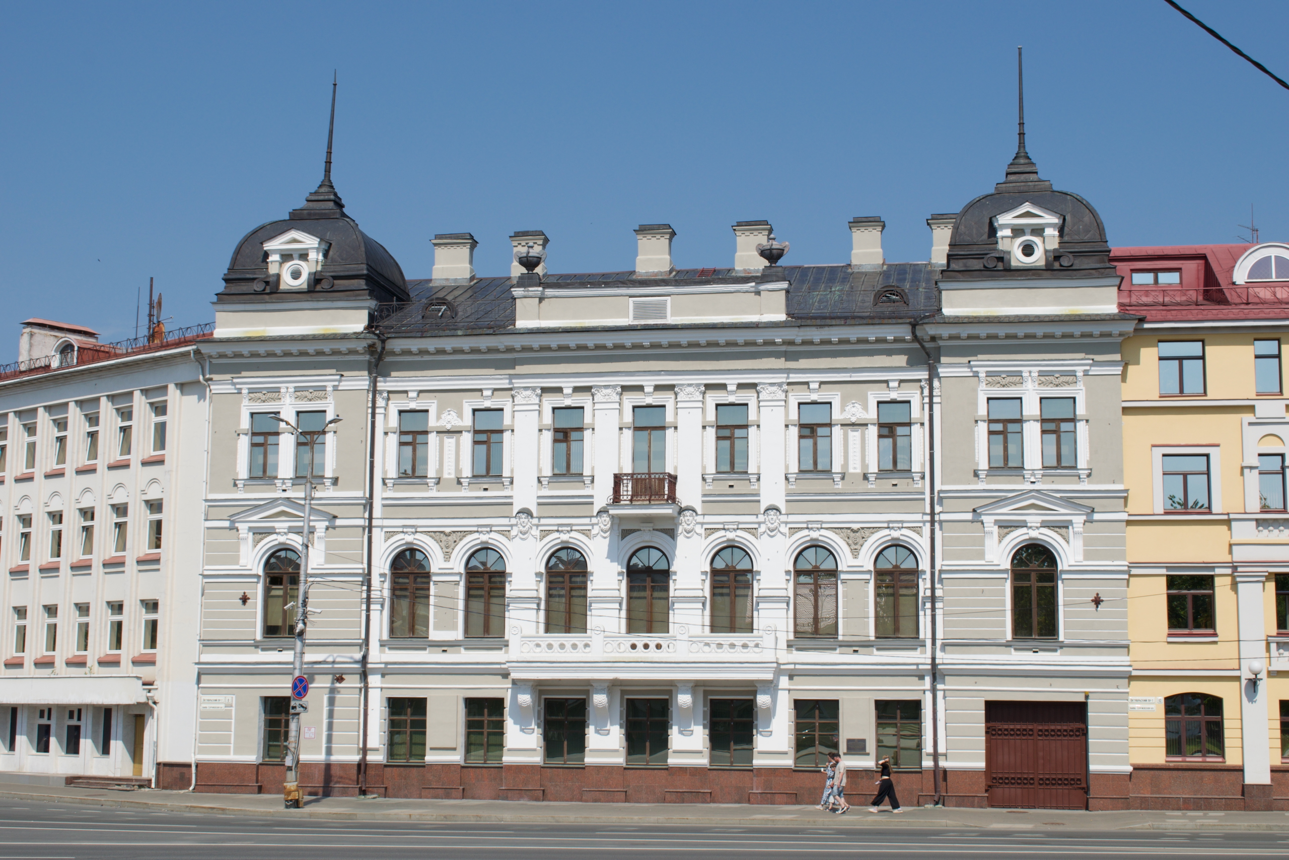 А вот зданию банка повезло, он сохранился. Этот дом со шпилями был построен до революции в 1902 году для Земского банка. Говорят, что в этом здании во время войны немцы устроили свой банк, поэтому оно и уцелело. Старинный дом и сегодня используется по своему прямому назначению. Его занимает Банк России.