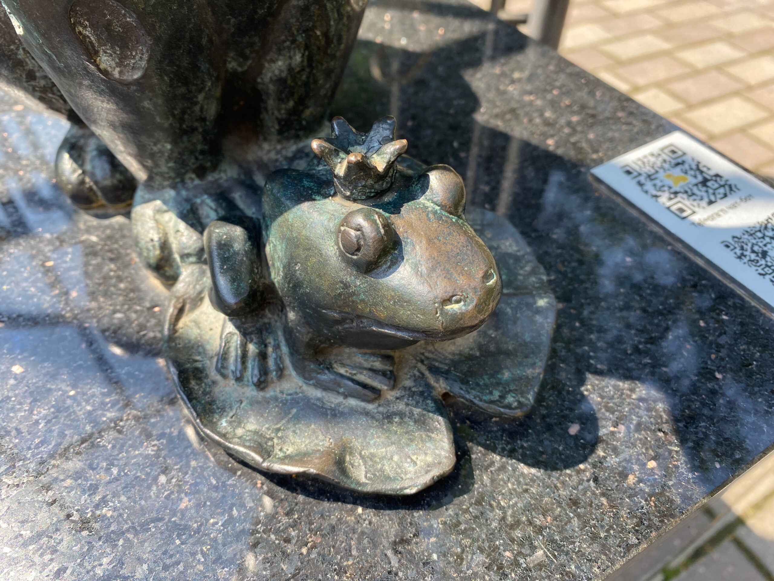 В ногах у Барсика Мити сидит лягушка с короной на голове. Зачем корона, не могу сказать, а вот сама лягушка здесь неслучайный элемент. Когда храм строился, недалеко было болото или лужище, как тогда говорили. Отсюда храм назывался Церковь Сергия с Залужья. Ну, а болото традиционно ассоциируется с лягушками-квакушками. Правда, царевен среди них я ни разу в жизни не видела.