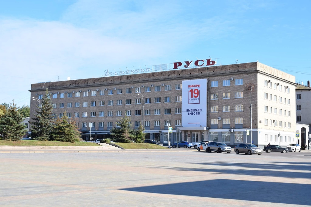 Справа от здания администрации находится здание гостиницы «Русь». Сразу видно, что оно тоже строилось в советское время и тоже по типовому проекту.