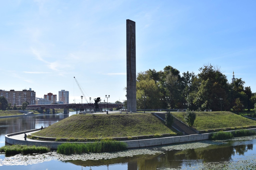 С набережной реки Орлик через мостик мы перебираемся на Стрелку в месте слияния Орлика и Оки. Как уже говорилось, здесь в 1566 году и была заложена Орловская крепость. На Стрелке находится парк, который так и называется «Парк Орловская крепость». На самом конце Стрелки устремилась ввысь стела в честь 400-летия Орла. Недалеко от нее — памятник воинам освободителям города.