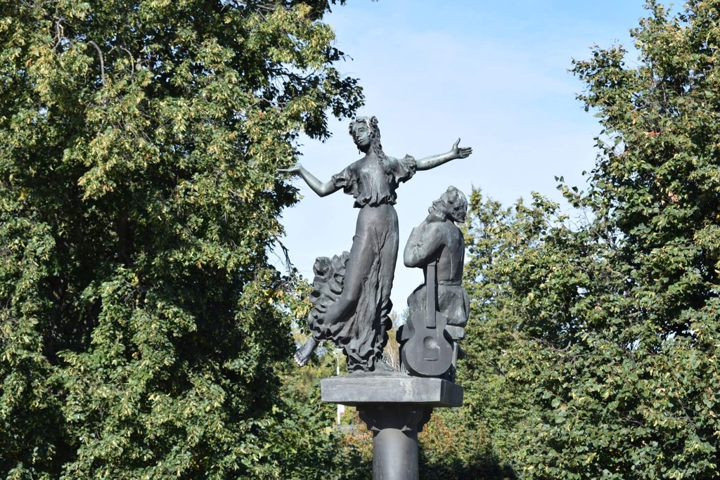 Например, вот такие бронзовые фигуры Ивана Флягина и его возлюбленной Грушеньки из «Очарованного странника. Всего таких композиций здесь пять.