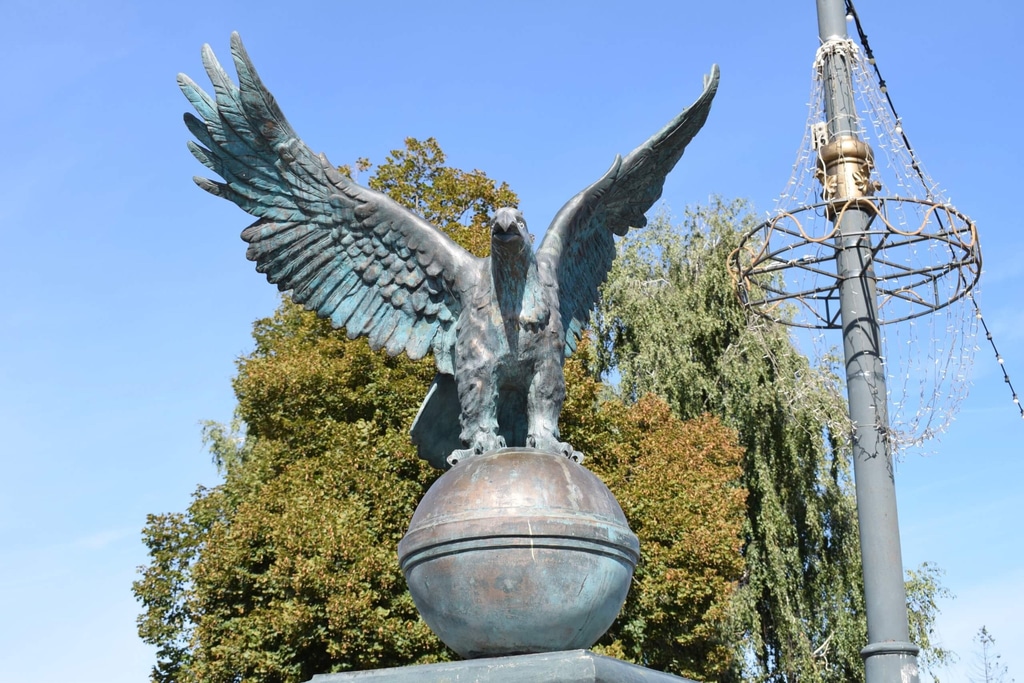 А мы следуем дальше на другой берег Орлика. На мосту расправил крылья символ города — орел.