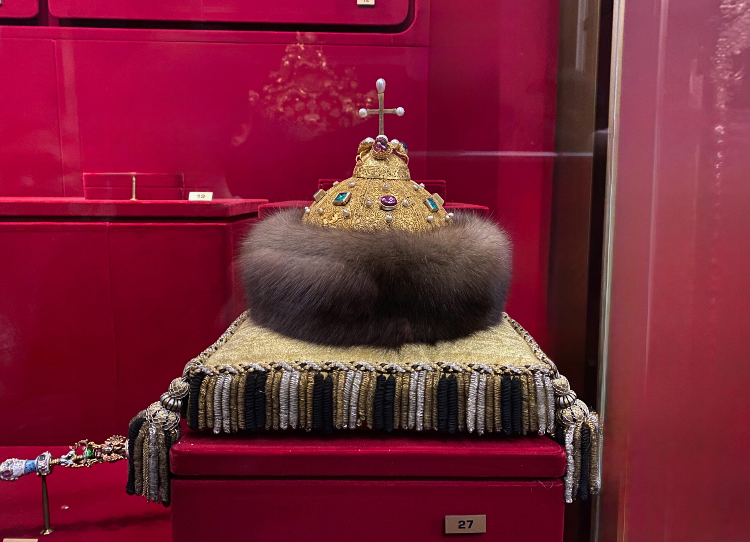 Один из самых знаменитых и древних экспонатов Оружейной палаты — шапка Мономаха. Это царский золотой головной убор, отделанный драгоценными камнями и соболиным мехом. Весит шапка около одного килограмма.