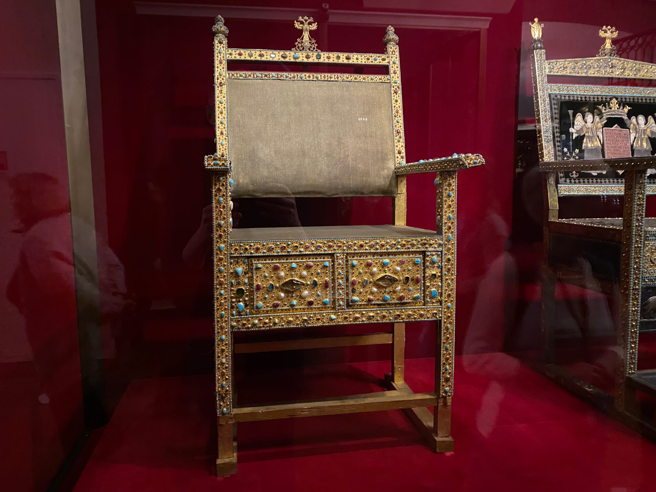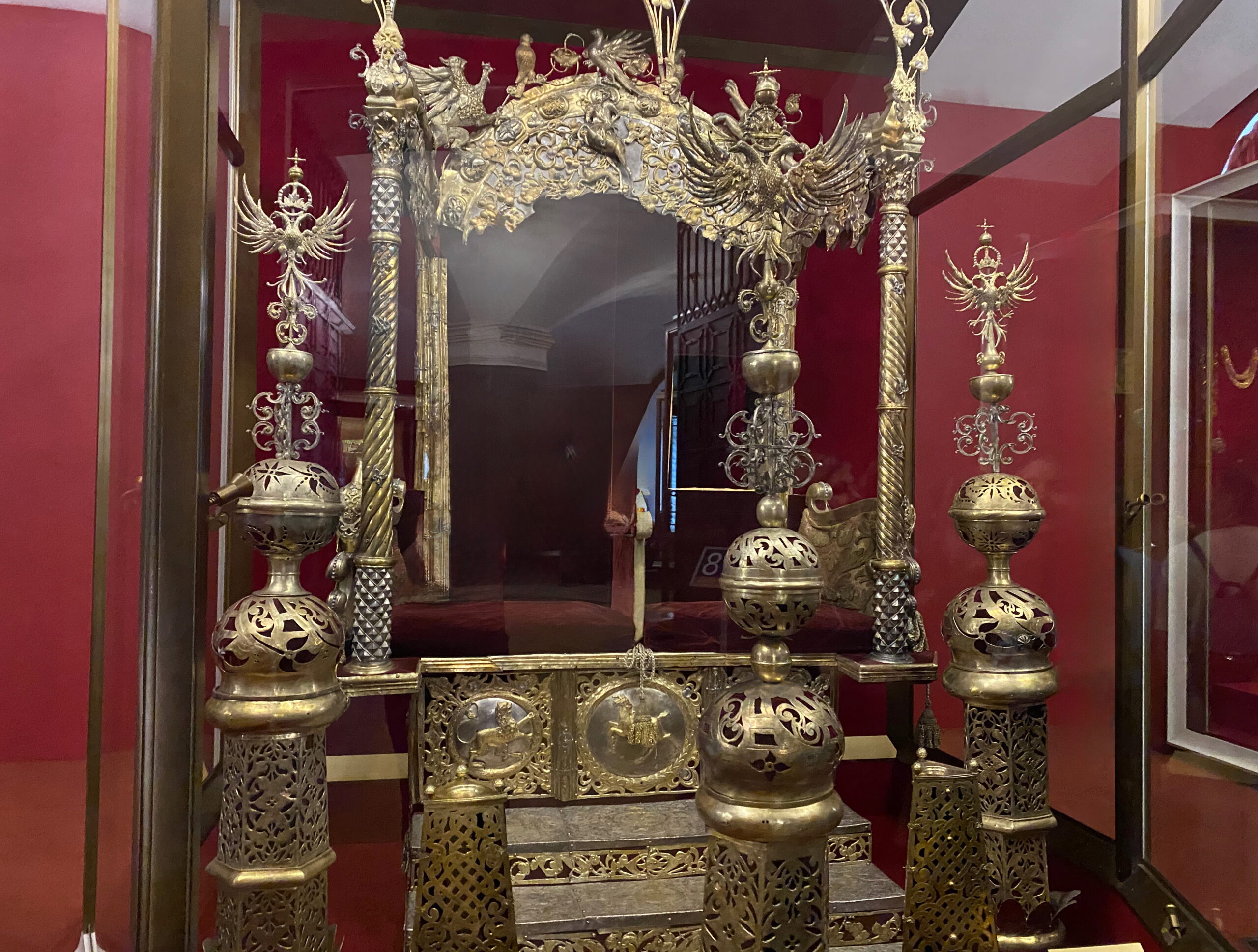 В Оружейной палате можно увидеть и деревянный трон Михаила Романова. Изготовили его в начале 17 века иранские мастера. Это был подарок иранского шаха русскому царю. Трон использовался Михаилом Романовым и во дворце, и во время походов.