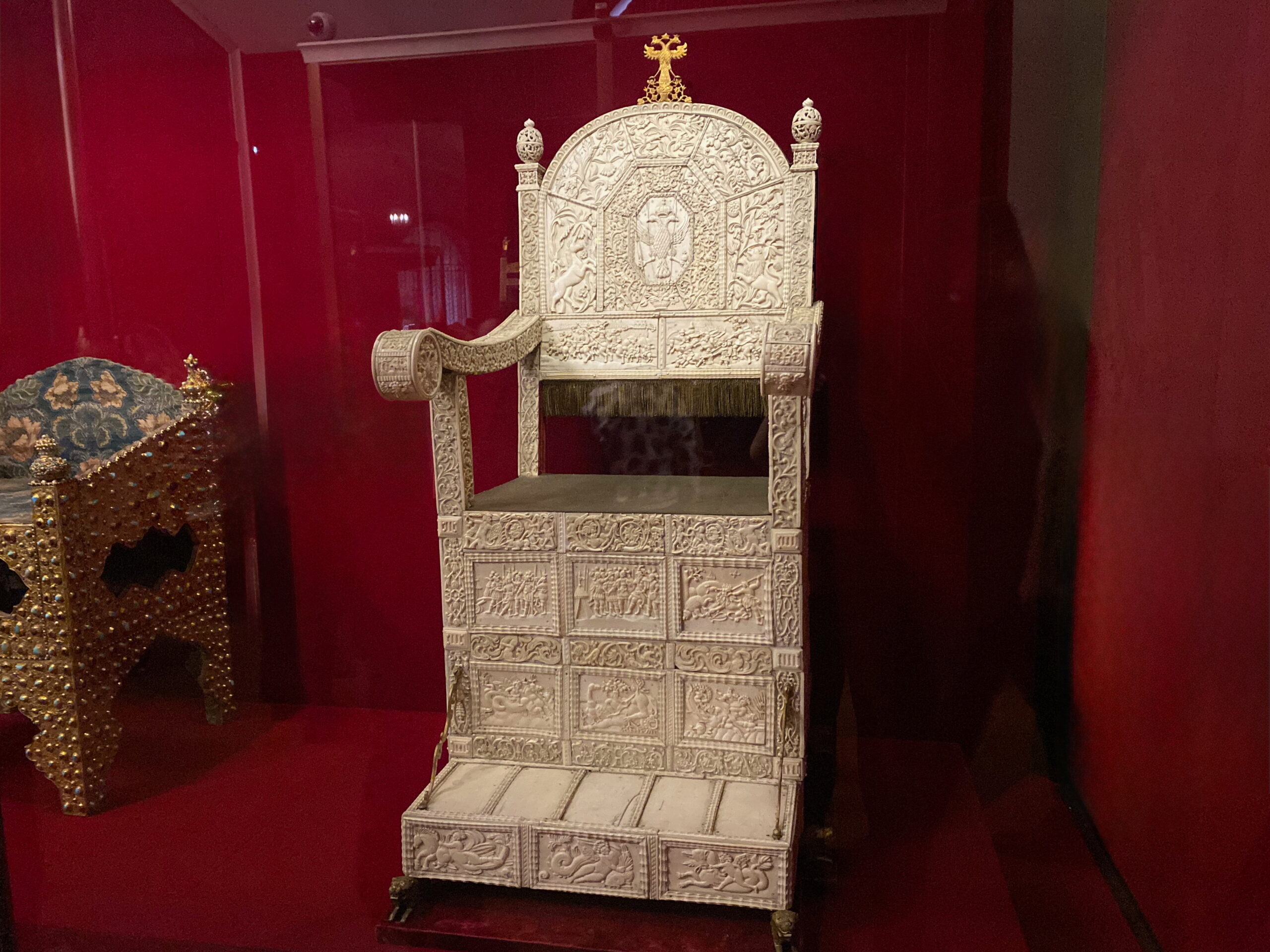 Еще один трон в Оружейной палате, облицованный пластинами моржовой и слоновьей кости, якобы принадлежал Ивану Грозному. Однако, на самом деле это не так.