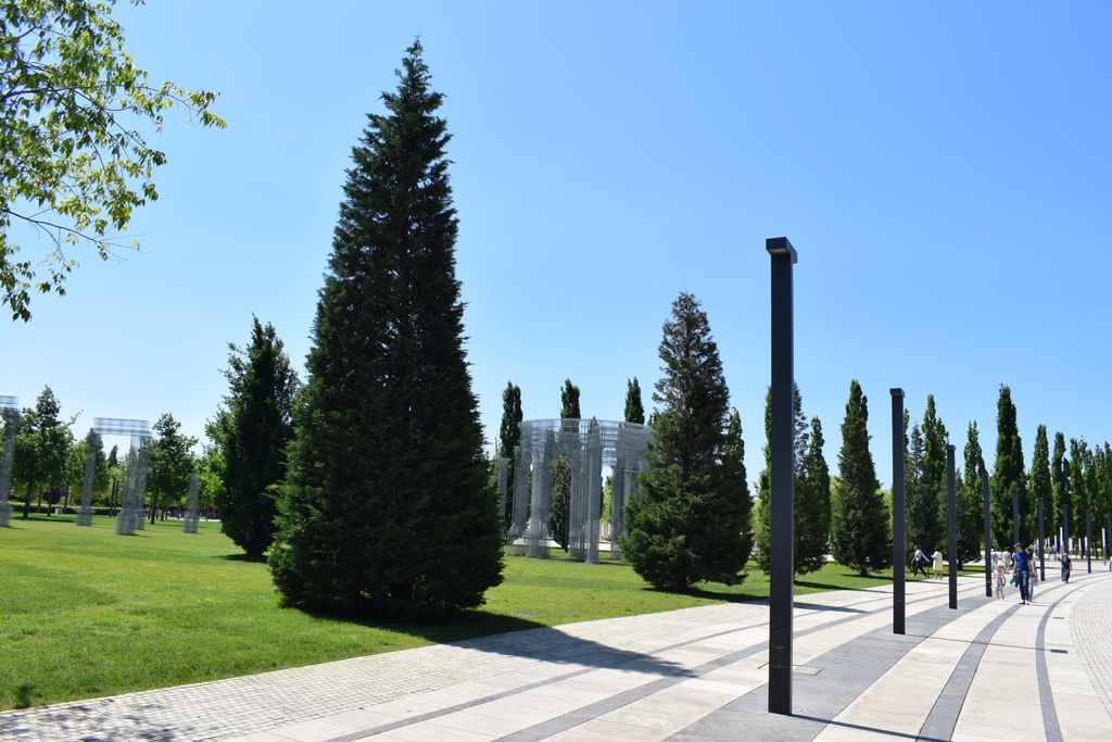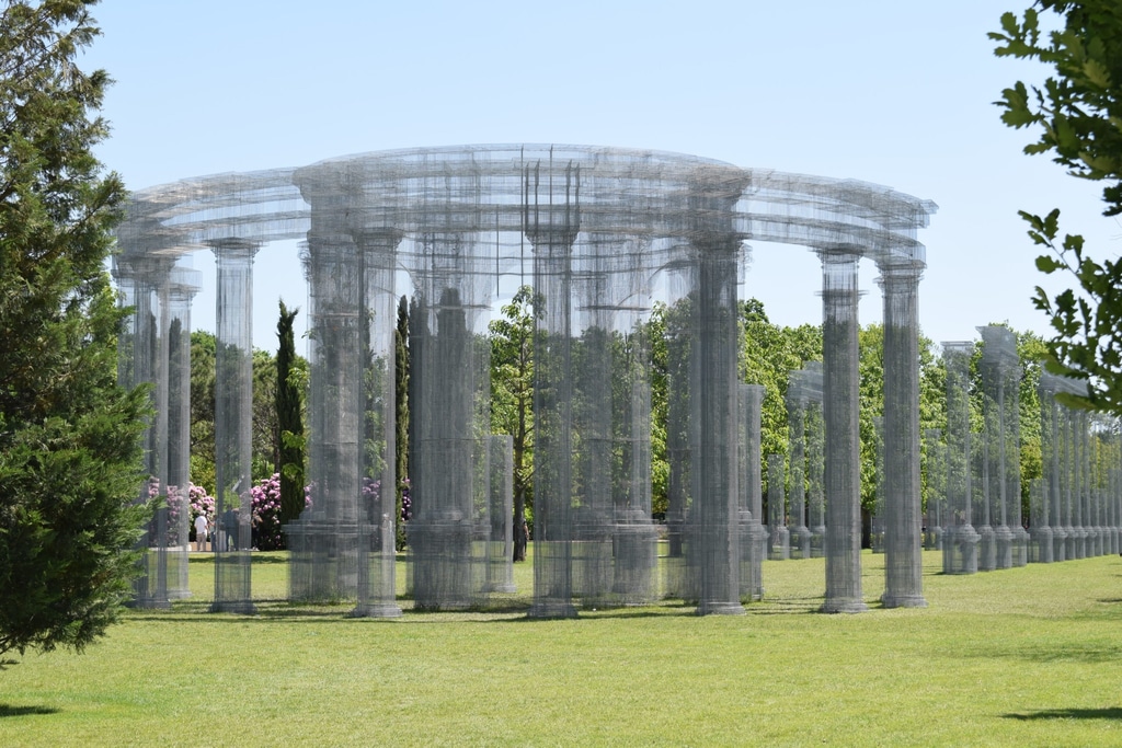 Между конусообразными кипарисами виднеются оригинальные конструкции древних римских и греческих руин. Арт-объекты создавались итальянской фирмой из специальной проволоки. Называется это чудо «Абстракция».
