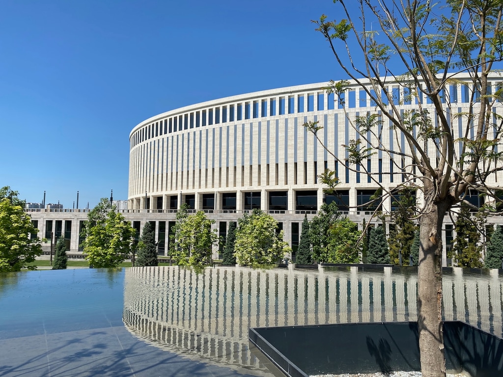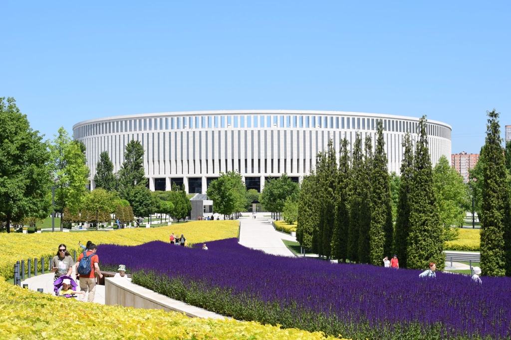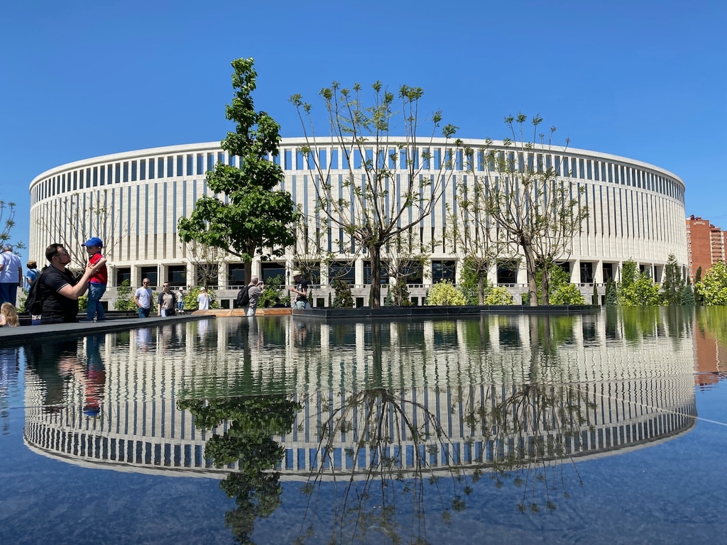 Строительство футбольного стадиона началось в 2011 году, а закончилось в 2016 году. По международной классификации стадион имеет самый высокий четвертый класс. Его вместимость — 35 тысяч мест. Стадион имеет форму кольца и чем-то напоминает итальянский Колизей. Часто его так называют и сами краснодарцы. Отделан стадион тоже на итальянский манер травертином. На прилегающей к стадиону территории — фонтан с ниспадающими потоками воды, экзотические пальмы и многое-многое другое.