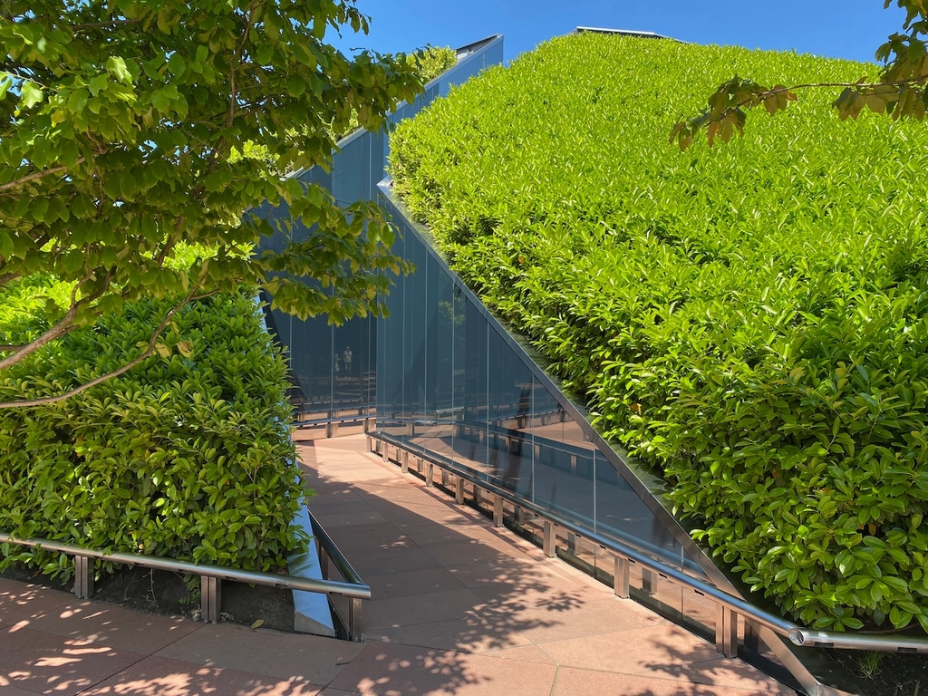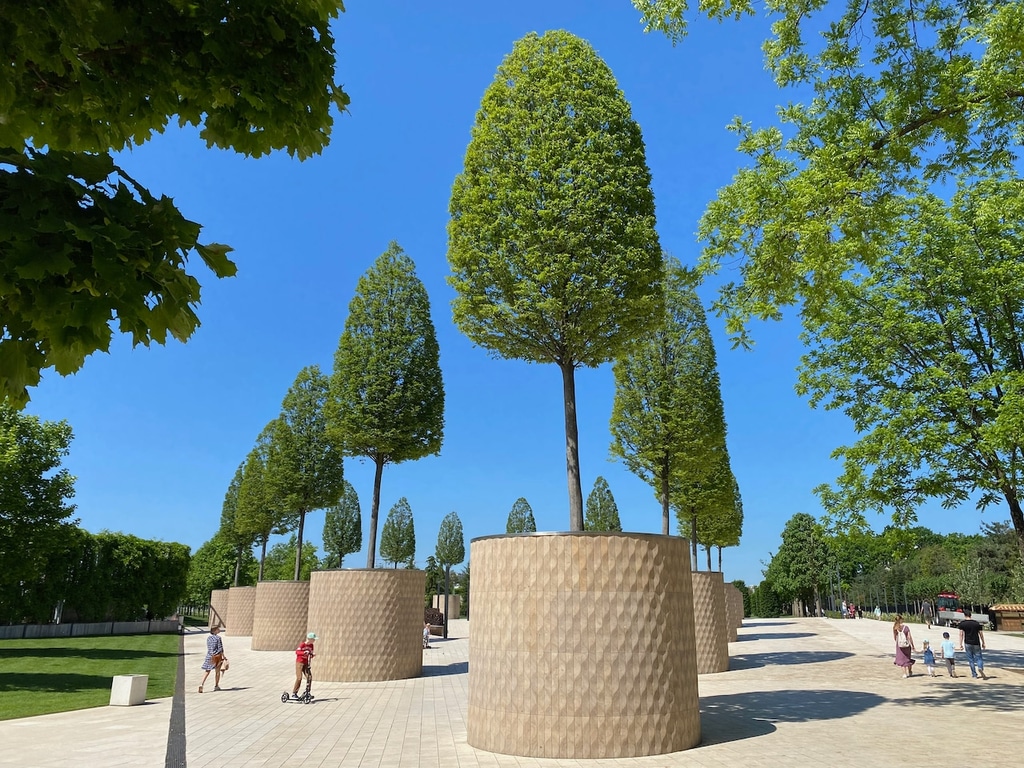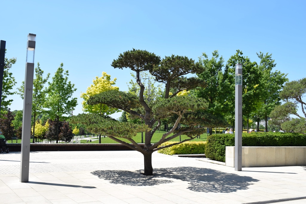Сразу у входа — ряды аккуратно подстриженных деревьев в огромных кадках.