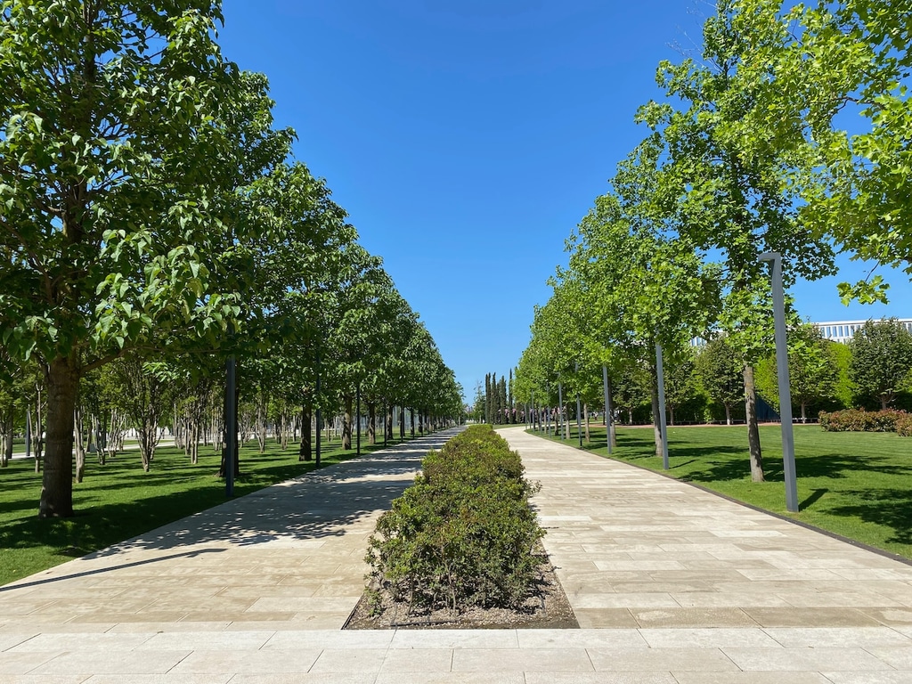 Вглубь парка ведет выложенная плиткой дорога, а вдоль нее тянутся стройные ряды деревьев, стриженный газон, цветочные кусты.