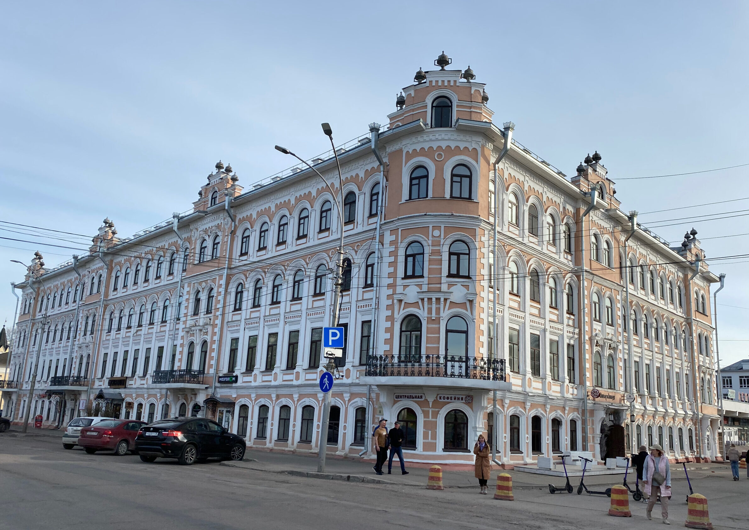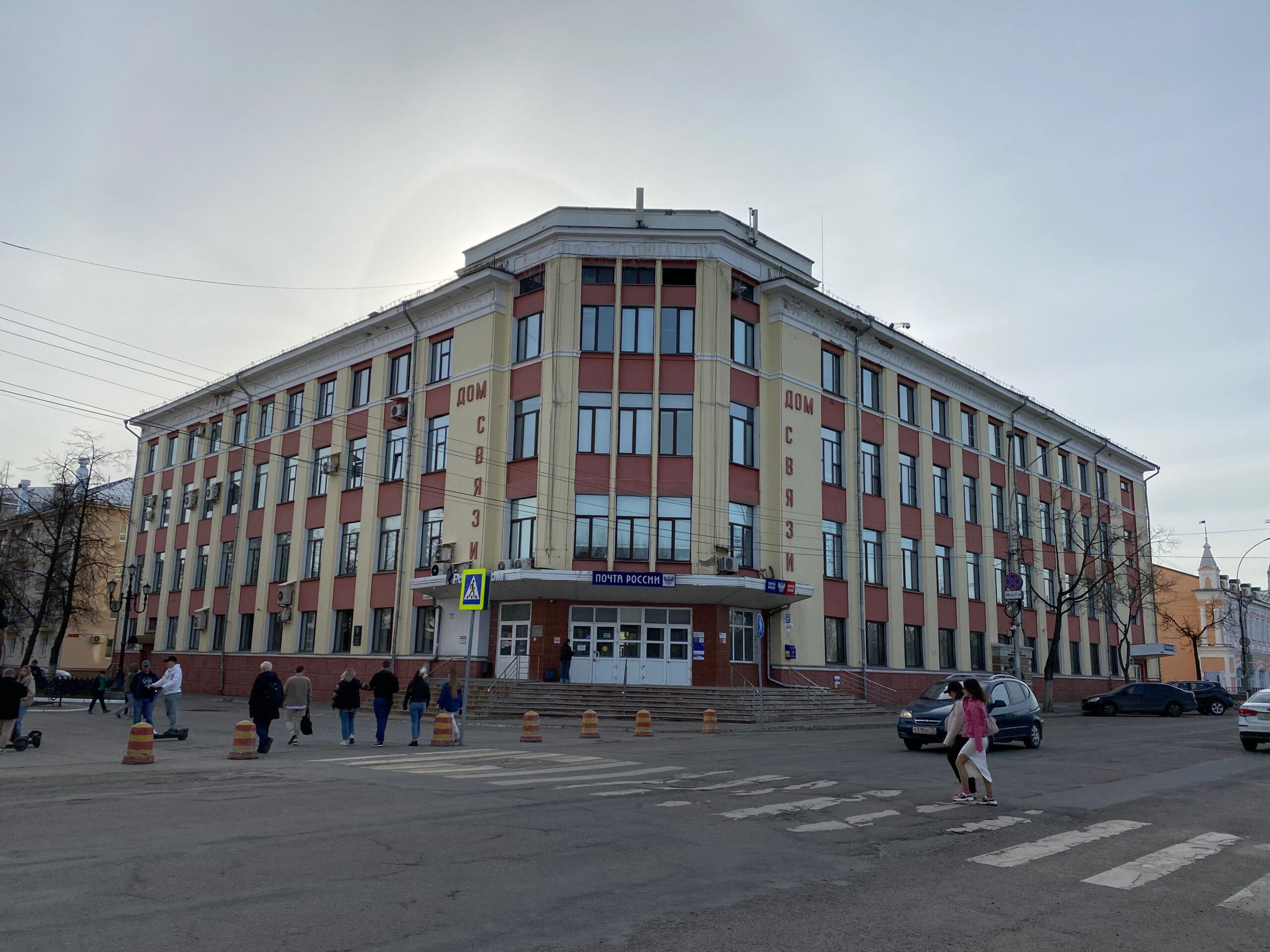 Через улицу, Советский проспект, от памятника героям революции привлекают внимание постройки разных эпох. Дореволюционные здания городской Думы и гостиницы здесь соседствуют со зданием почтамта советских лет.