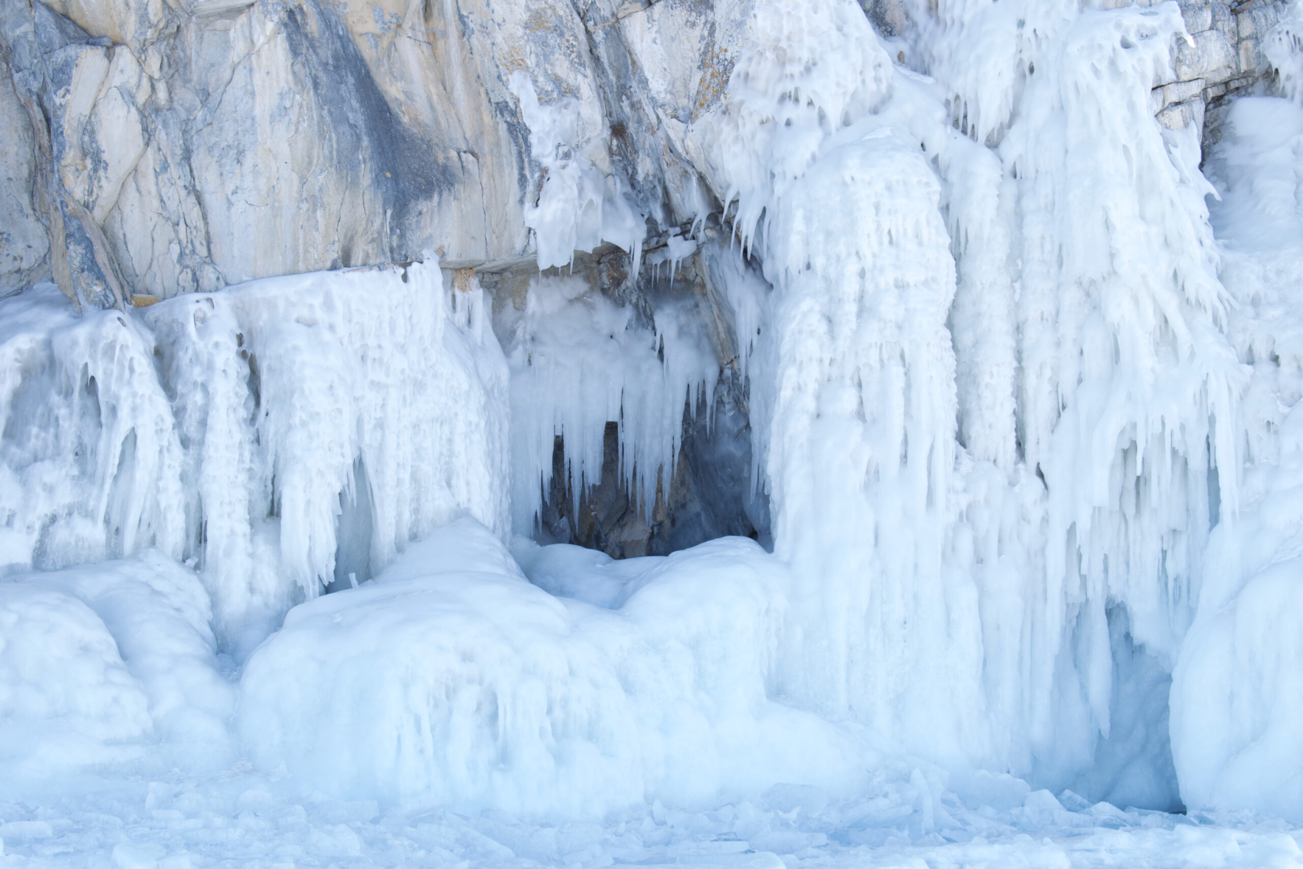 Зимой вход в пещеру найти непросто: его надежно закрывают снег и лед.