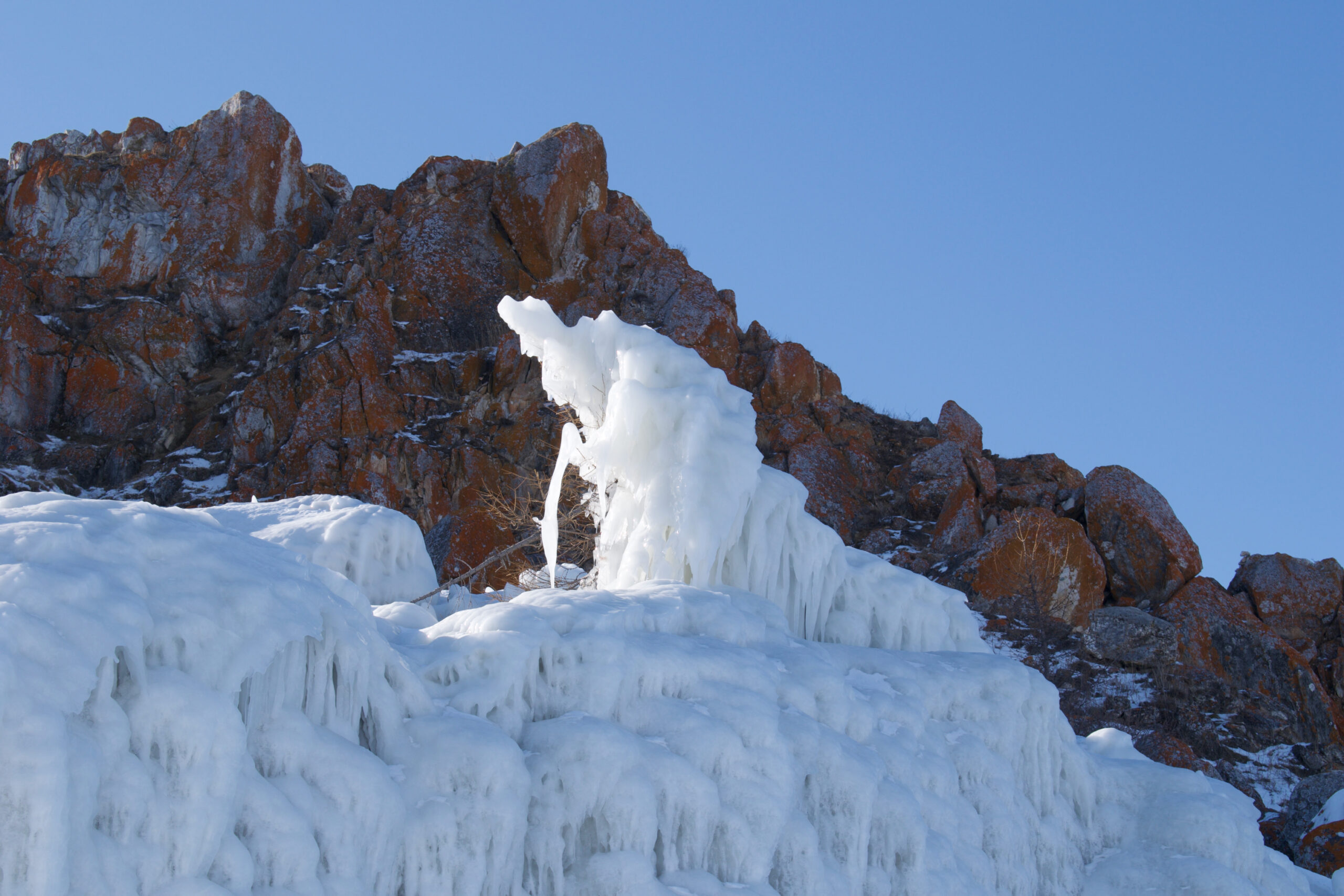 Возможно, там, среди сосулек и заснеженных выступов виднеется вход в пещеру? Когда-то здесь под звуки бубна проводились таинственные обряды и приносились жертвы.