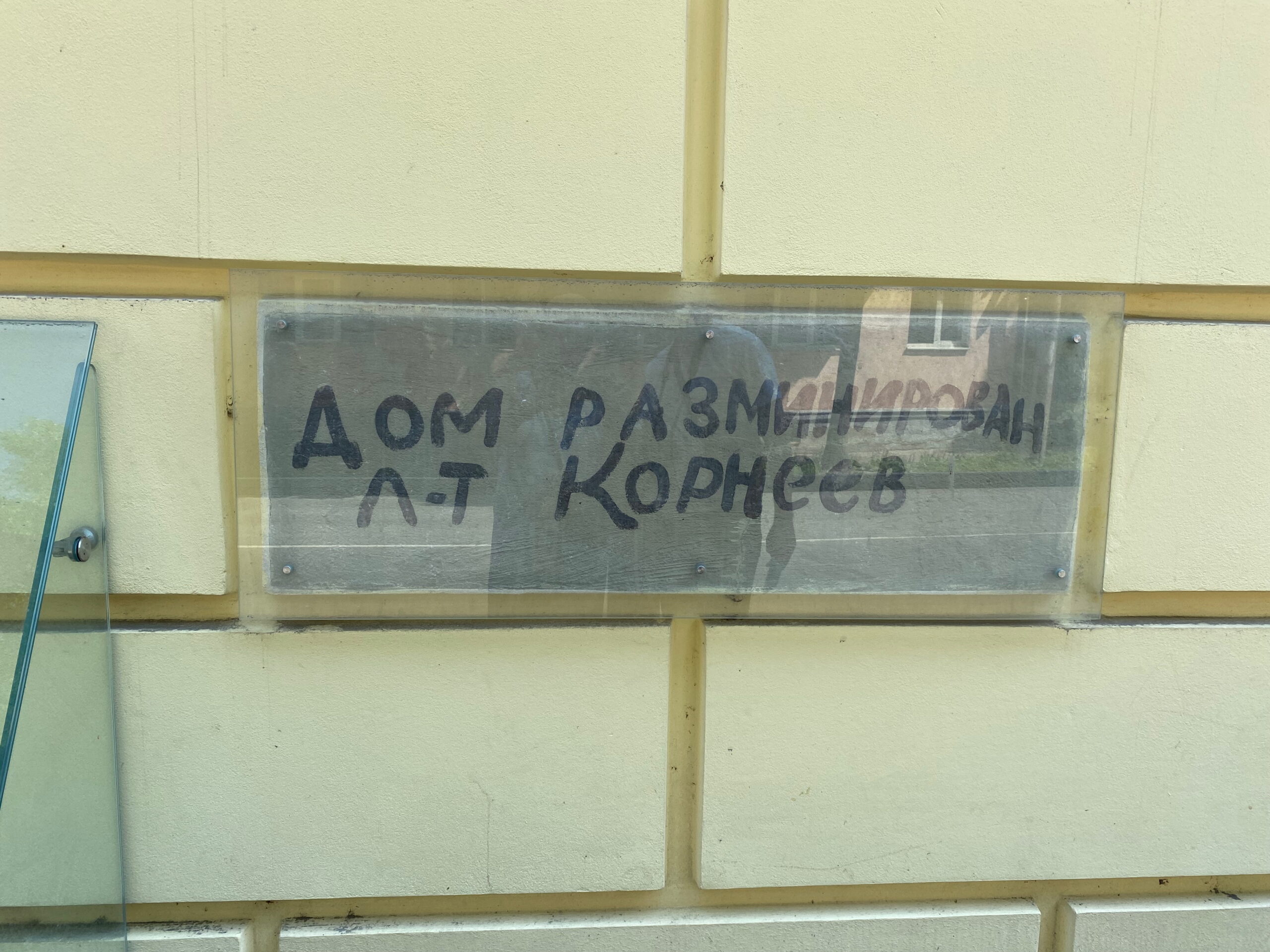 На здании картинной галереи памятная табличка «Дом разминирован. Лейтенант Корнеев». Такую надпись во время войны оставил один из бойцов батальона Корнеева. После отступления немцы заминировали Псков. Батальону Корнеева было приказано очистить район музея Поганкина от мин. Бойцы приказ выполнили и оставили на одном из домов вот такую надпись.