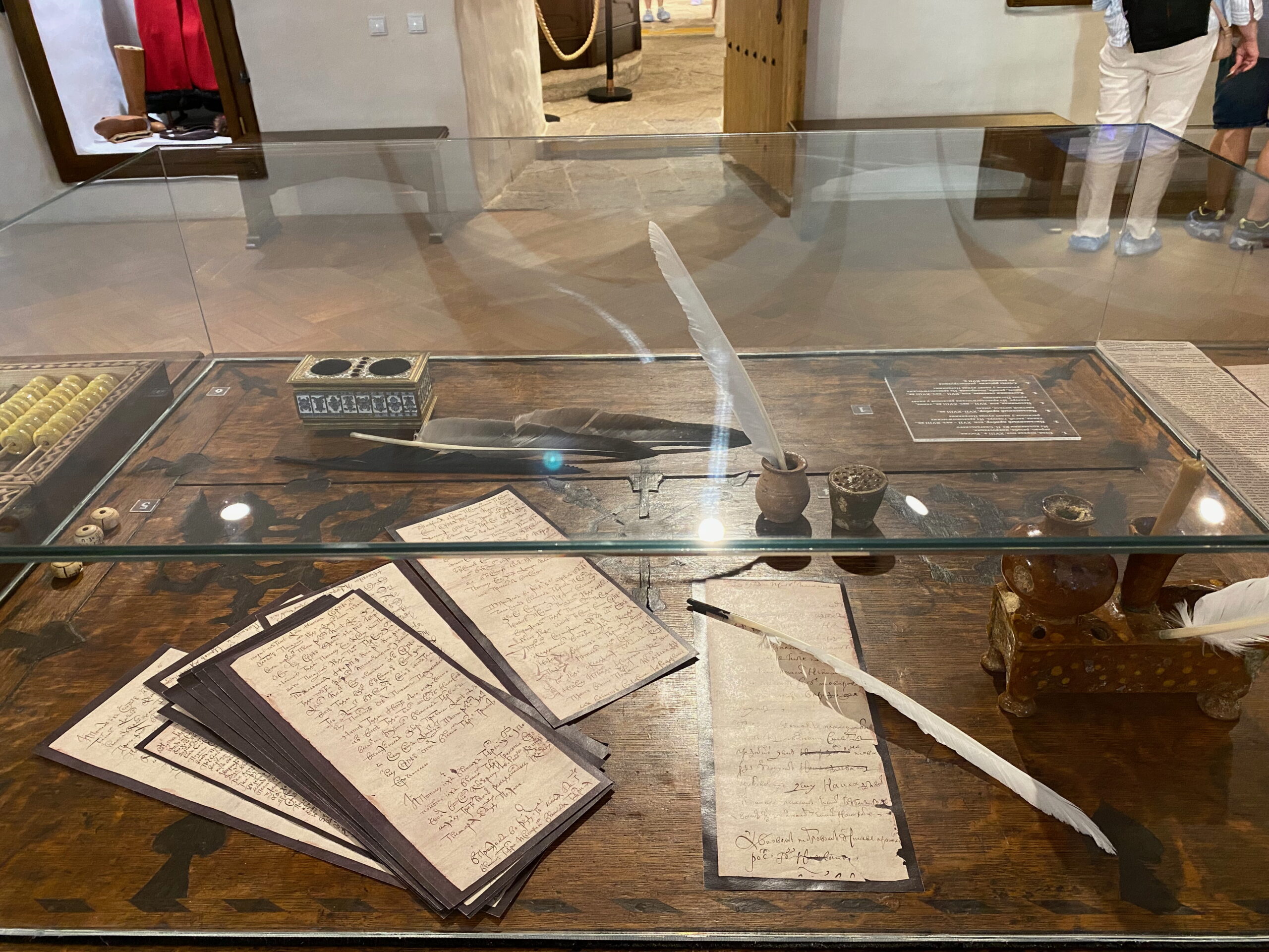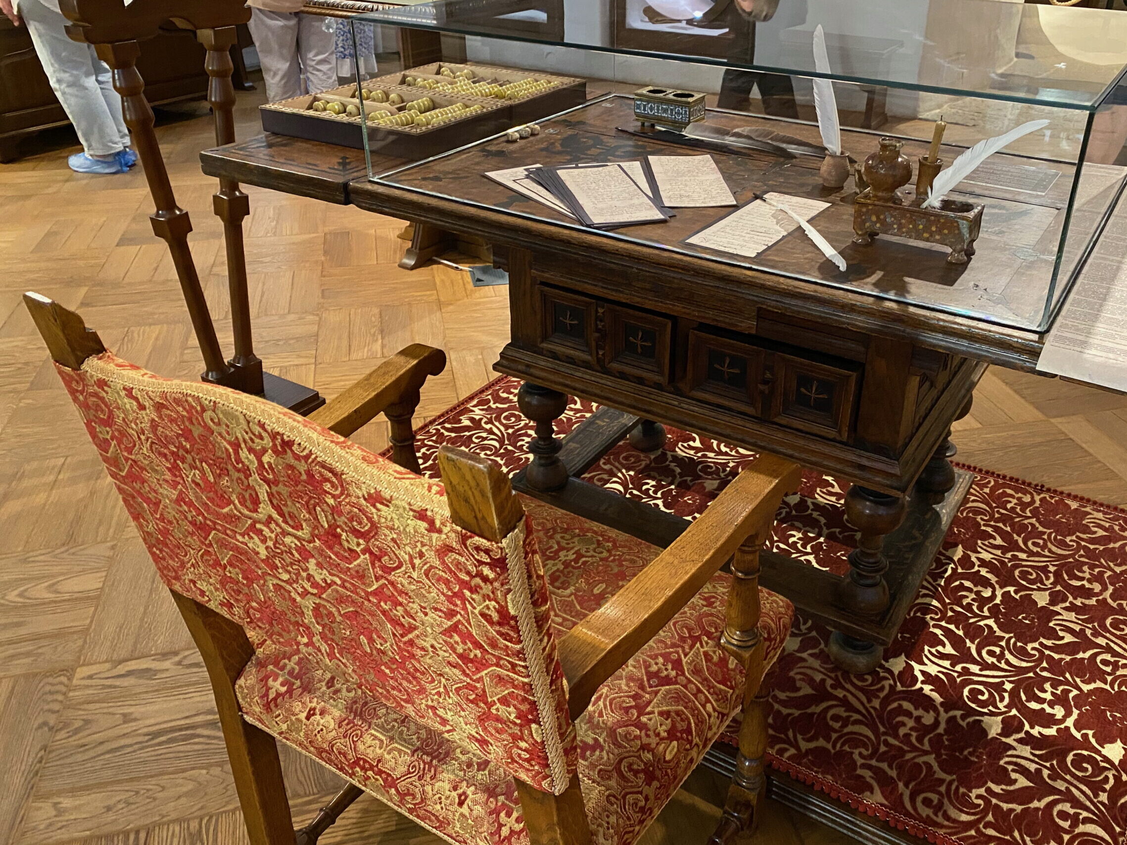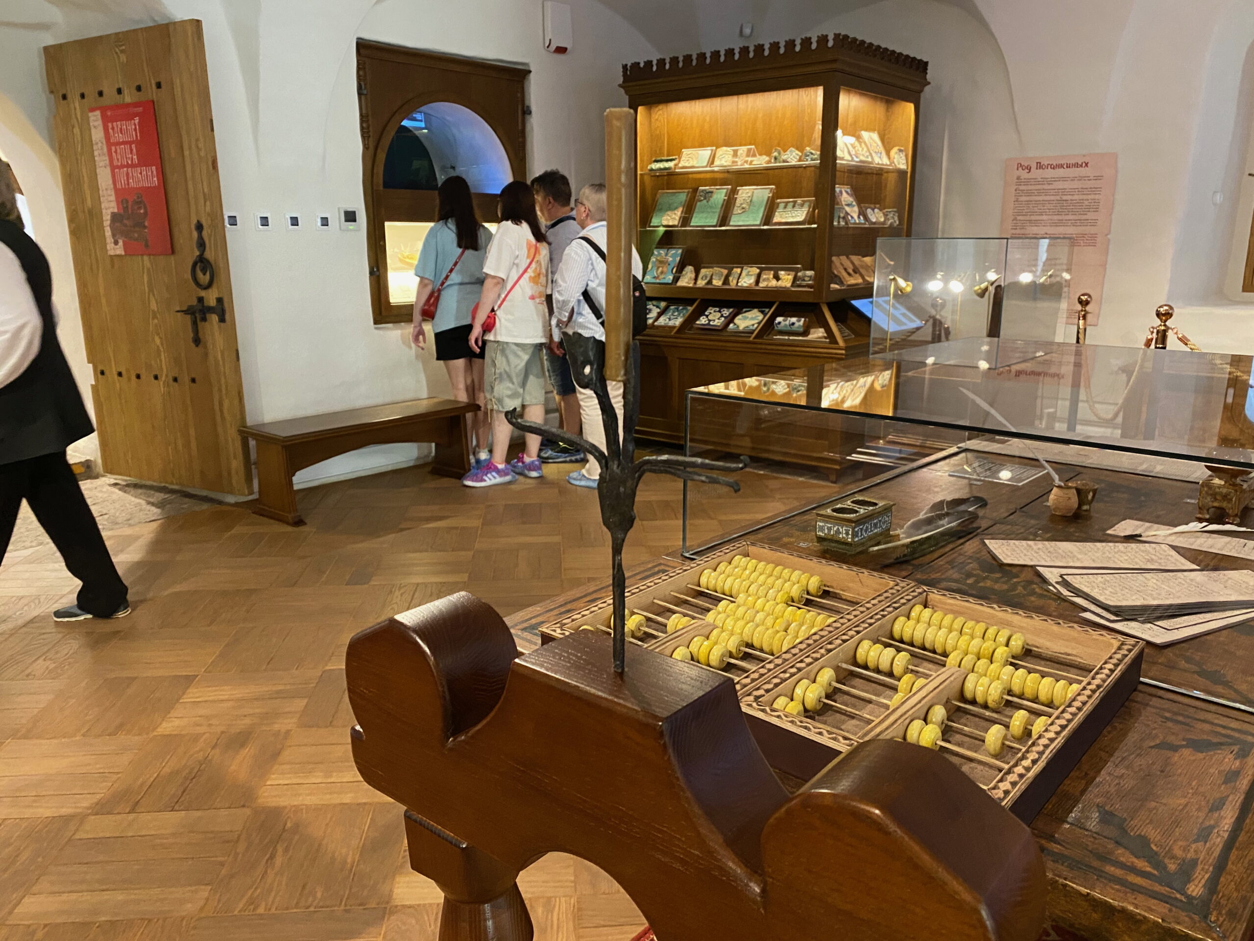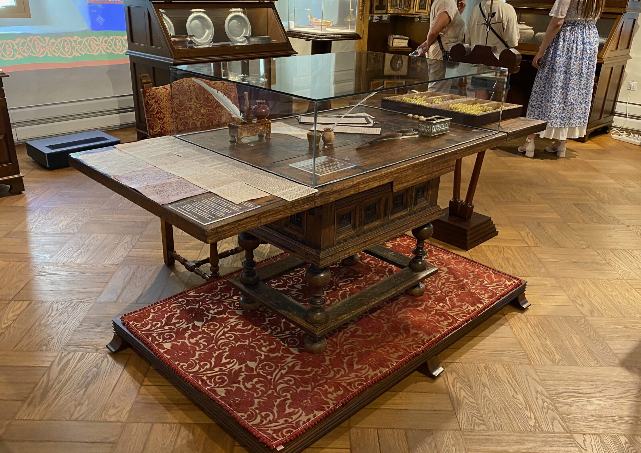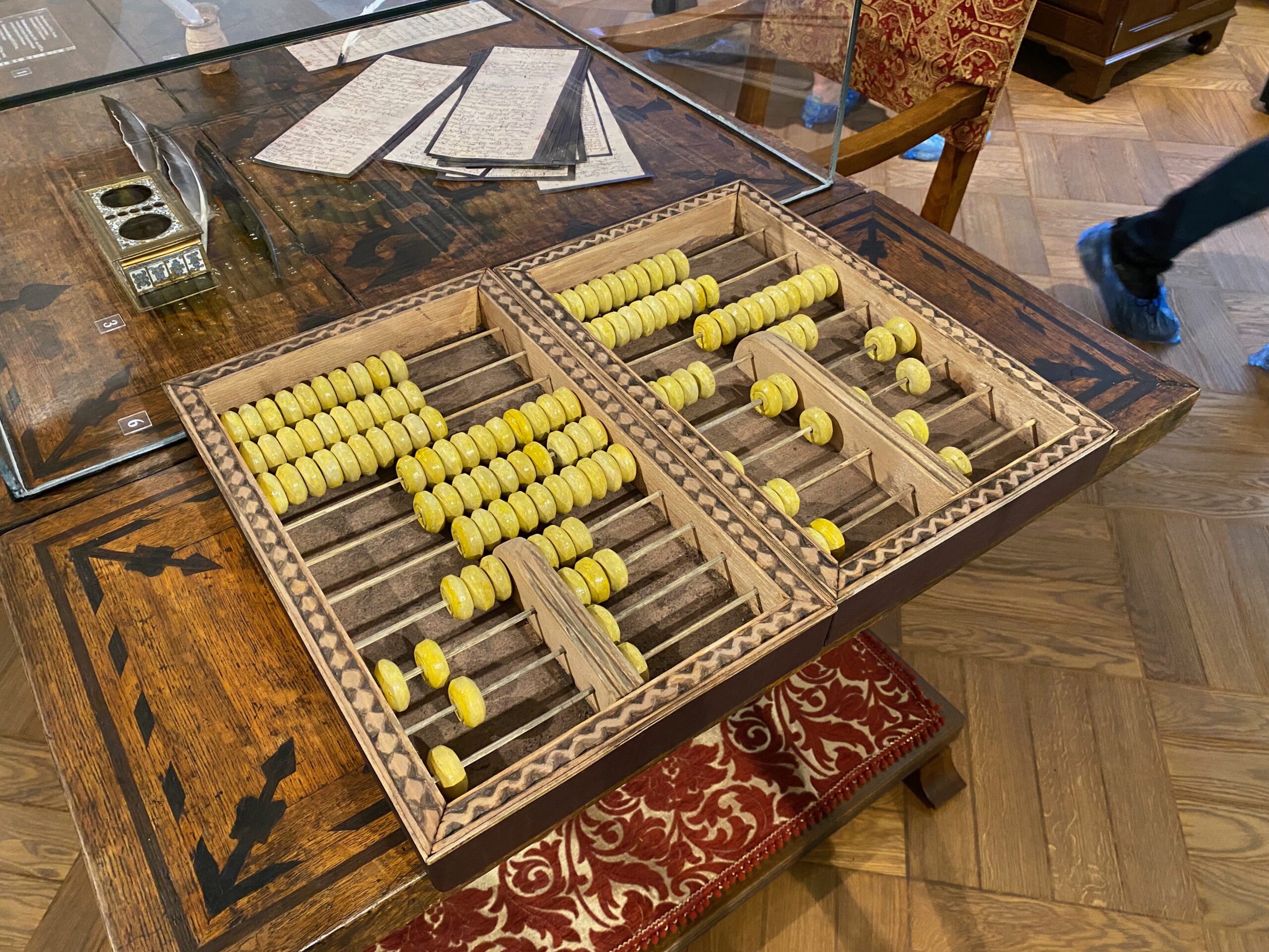 На столе разложены деловые бумаги, перья для письма, баночки с чернилами, русские счеты. Сегодня все это: перья, чернила, счеты — давно кануло в лету.