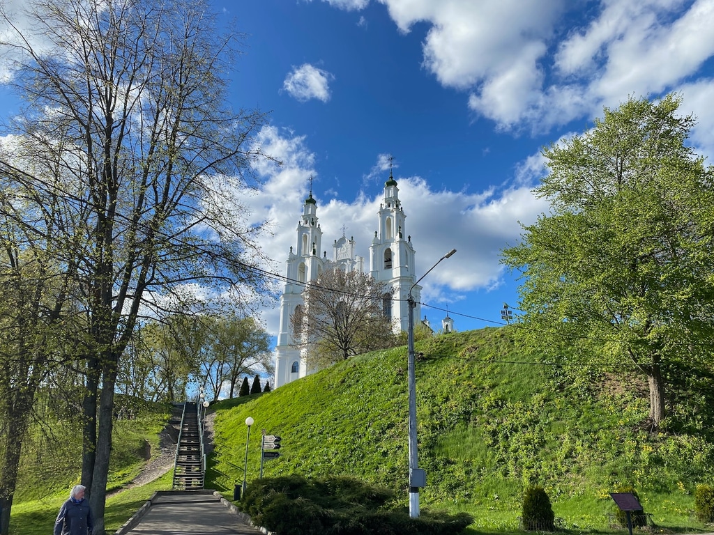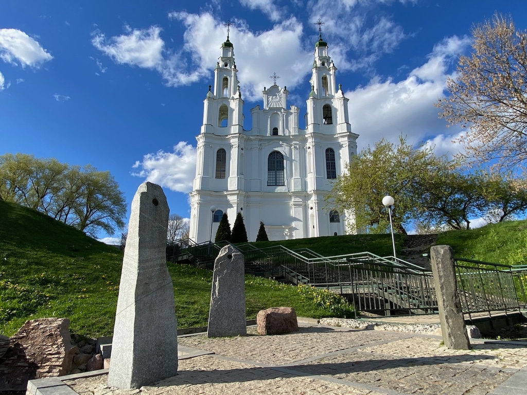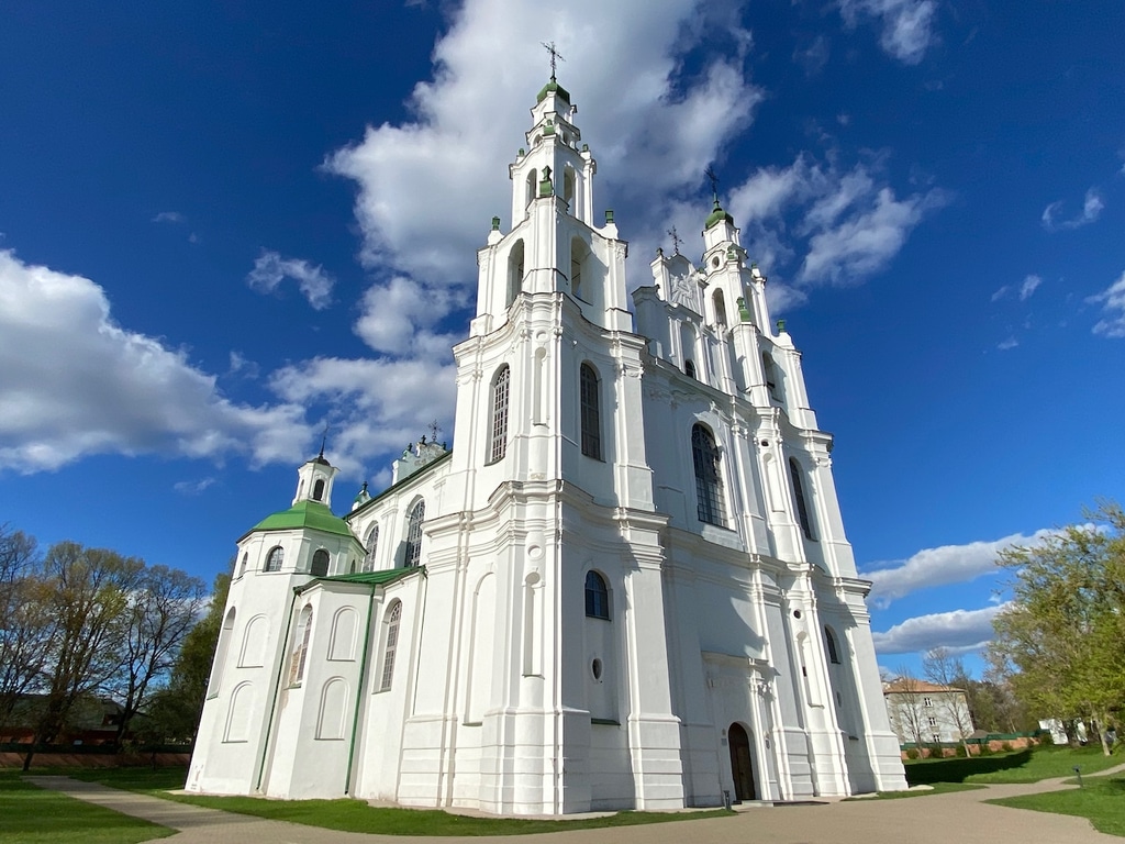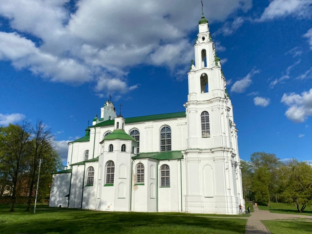Полоцкий Софийский собор стоит на высокой горе в конце проспекта. Эту гору, как и собор, тоже называют Софийской. Уже издалека видно, что храм мало похож на традиционную православную церковь, а скорее напоминает католический храм. Сказалось долгое польское влияние на эти земли.