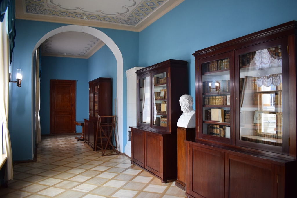 Следующим помещением лицея является библиотека, которая соседствует с Большим залом. По современным меркам она небольшая. Это все лишь несколько шкафов из красного дерева с книгами. Такой она была во времена Пушкина. Тогда она состояла, в основном, из учебников, периодических журналов, а также принесенных в дар книг самими лицеистами.